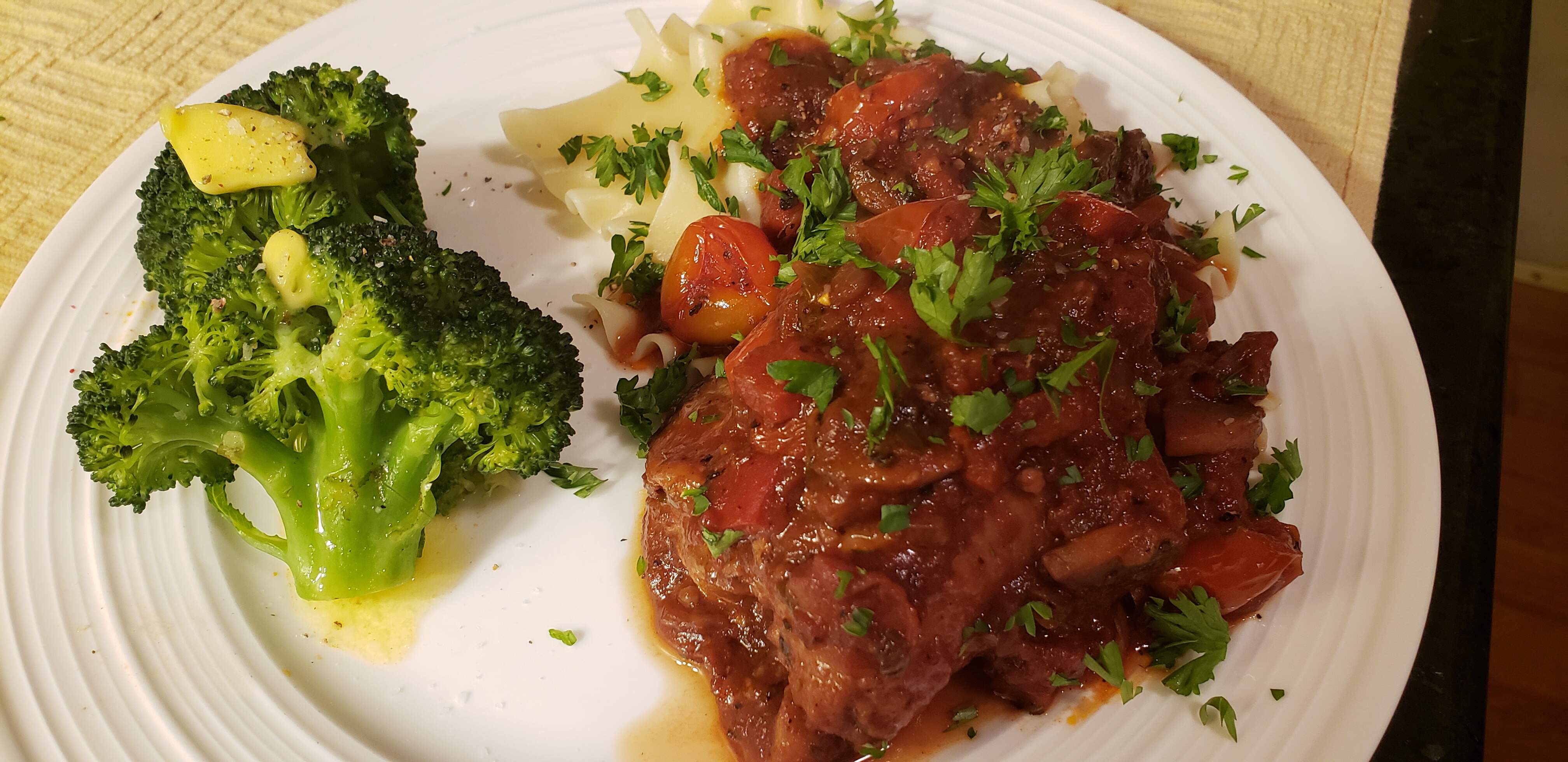 Chicken Cacciatore on mini lasagna egg noodles (World Market) with buttered broccoli florets alongside.