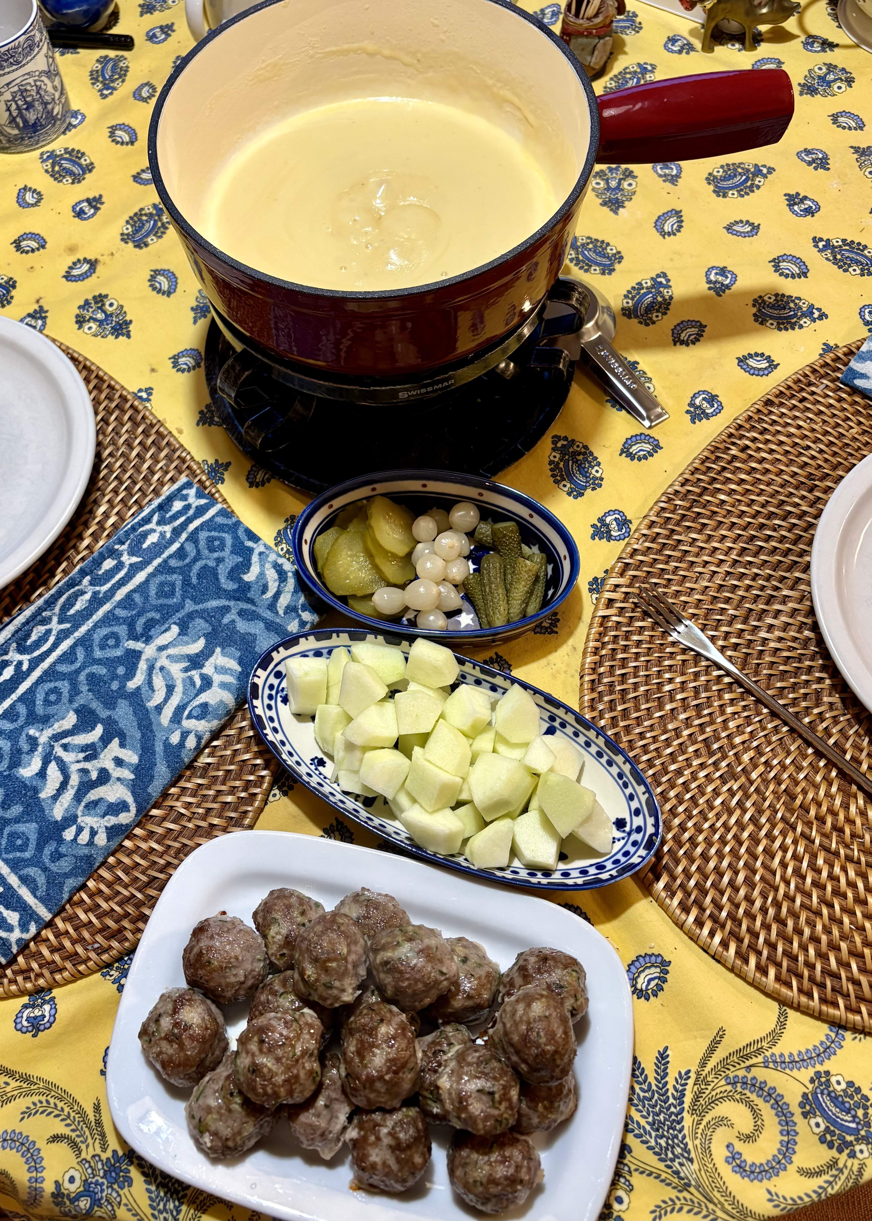 Dippers included beef meatballs with zucchini and nutmeg, pickled onions and cukes, and granny smith apples.