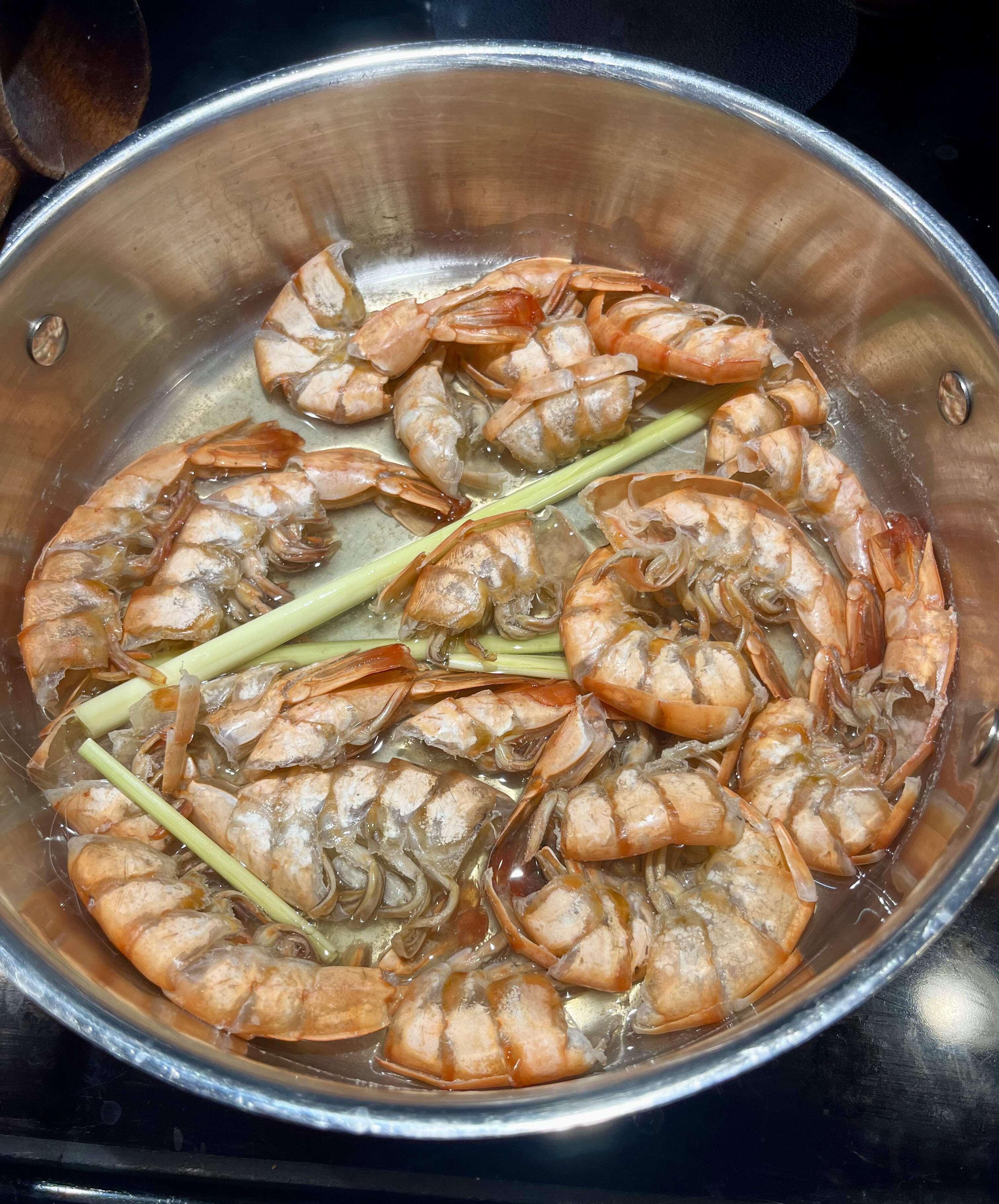 I made a minuscule amount of chicken stock from the wing tips we had in the freezer, and roughly the same amount of shrimp stock with shrimp shells also procured from the freezer stash, which I augmented with rough & inedible bits of lemongrass.