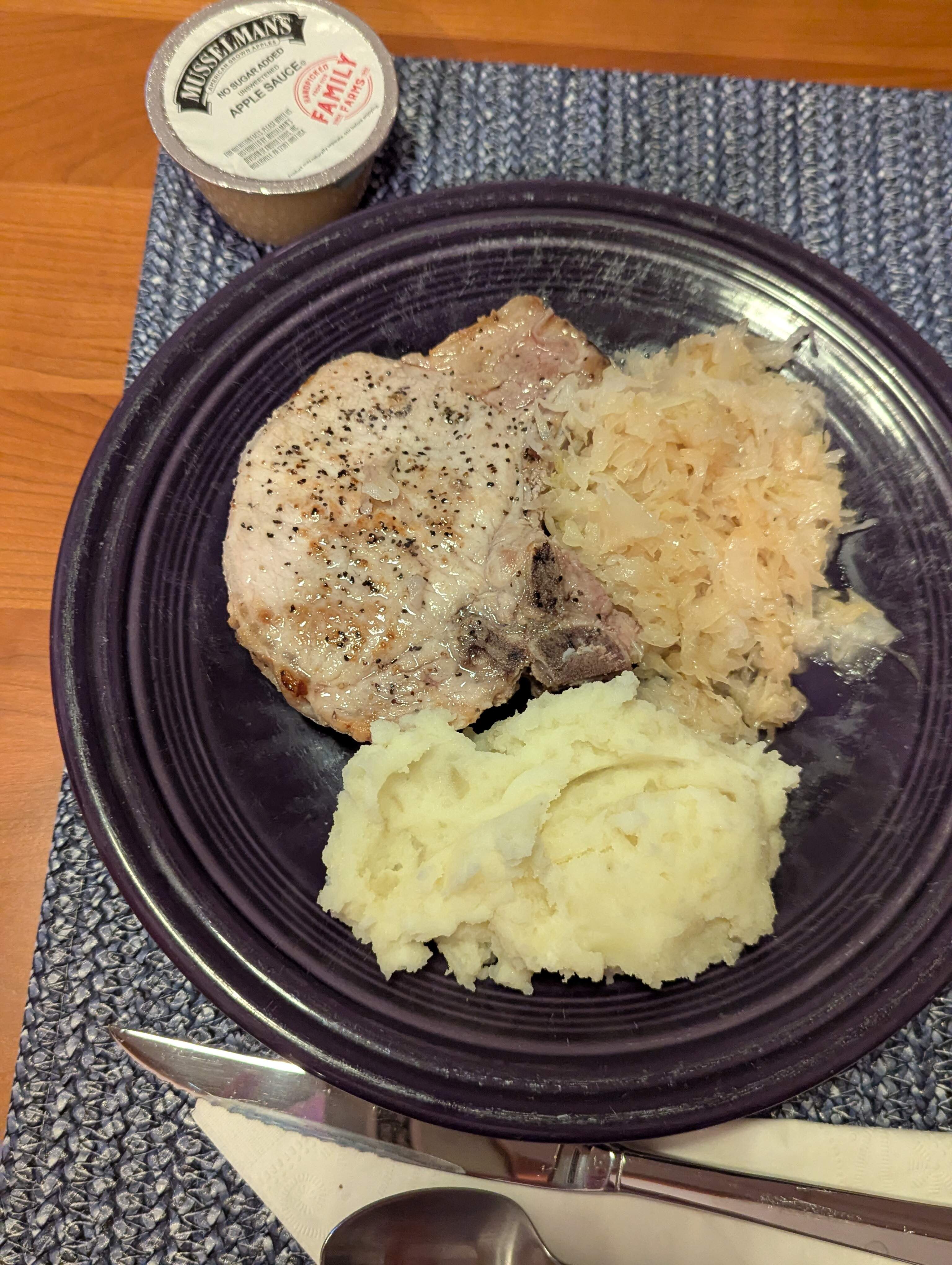 DH was jonesing for bone-in pork chops, sauerkraut, apple sauce and mashed potatoes. Couldn’t say no.