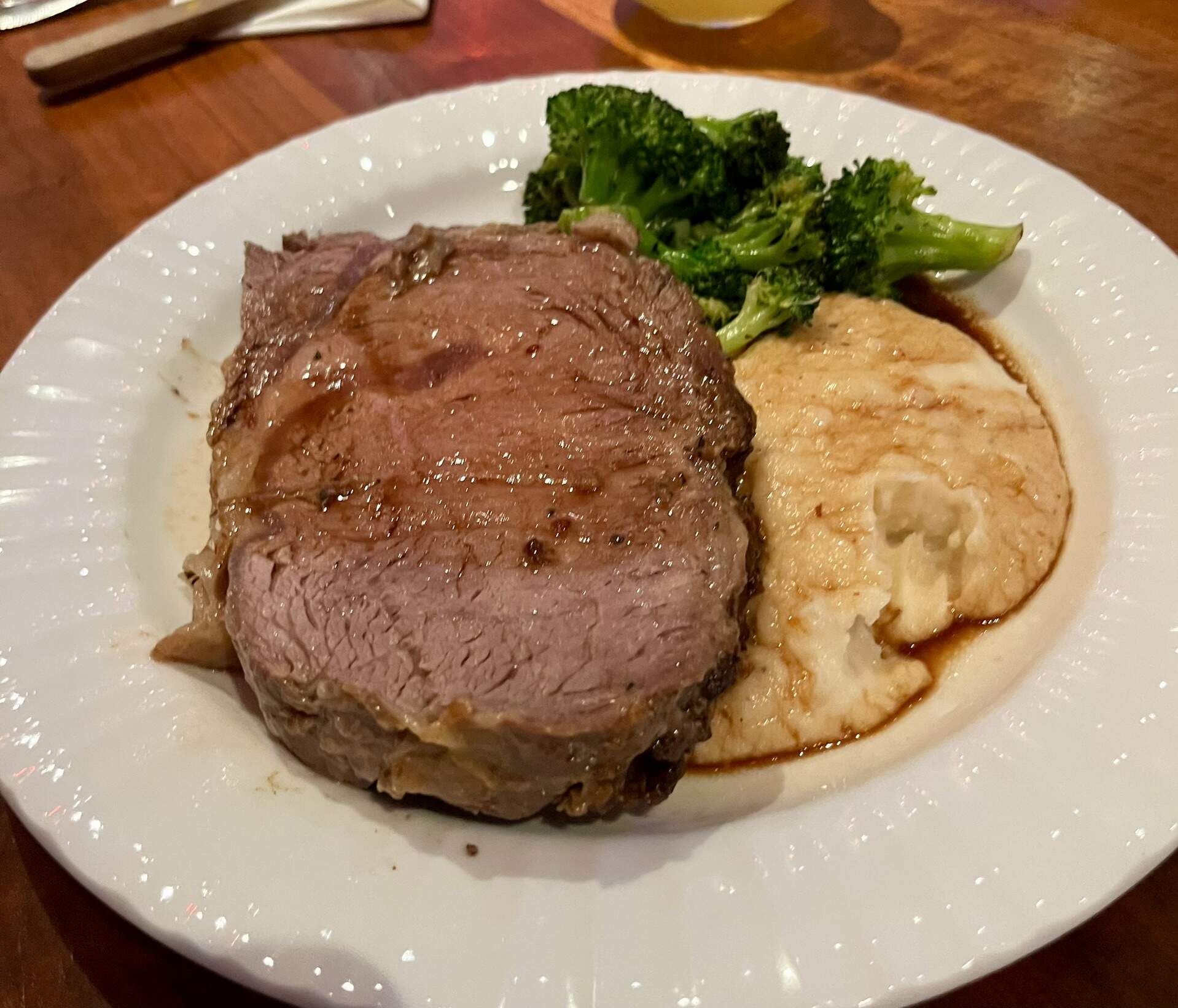 Next came the prime rib with mashed & broc — a massive slab of meat on the med-well side, but tender and flavorful. The bassist was happy with it ![]()