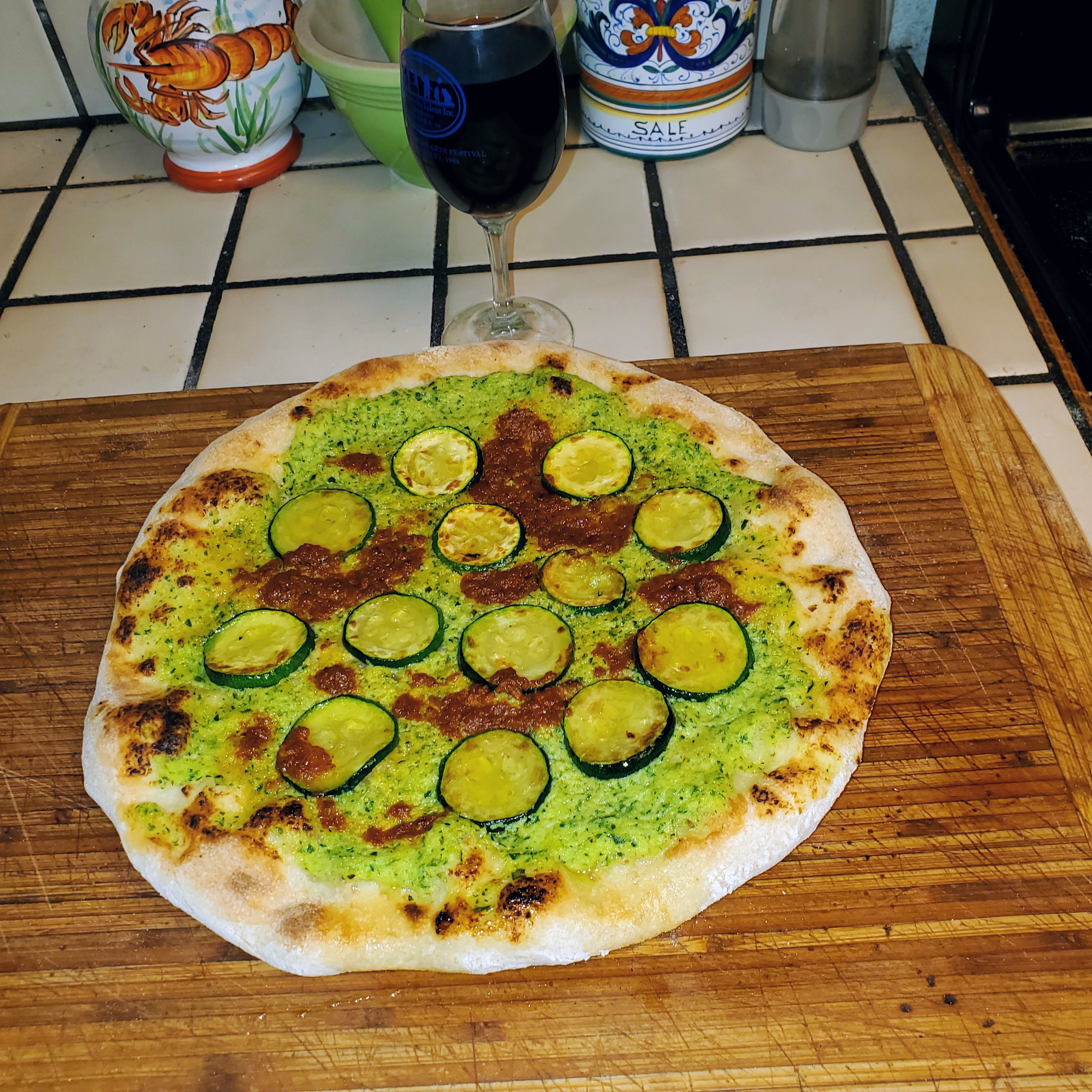 Zucchini puree with sun dried tomato pesto , topped with sliced Zucchini. Cheers.
