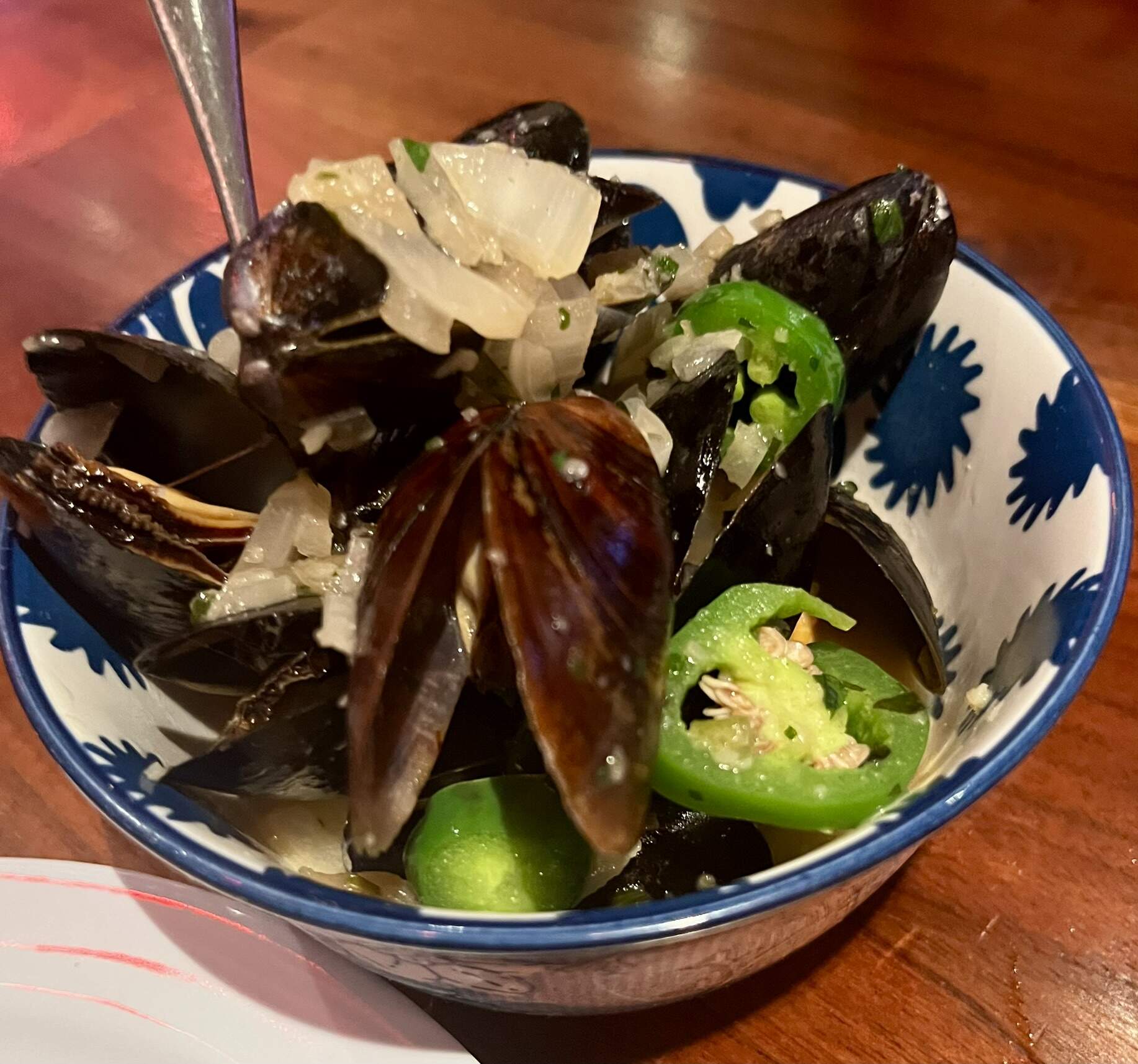 the speck & cheese croquetas skrompshiss (no pics), and finally the mussels in jalapeño sherry reduction really faboski, but I was positively stuffed at that point, and we had about 35 min left after our dinner to play a 60 min set list
