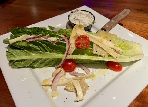 First up a ‘three-hearted’ salad with a very good Green Goddess dressing. I’m usually annoyed by the slab of lettuce plopped on a plate, i.e. ‘deconstructed’ salads one has to cut themselves, but the dressing more than made up for the silliness.