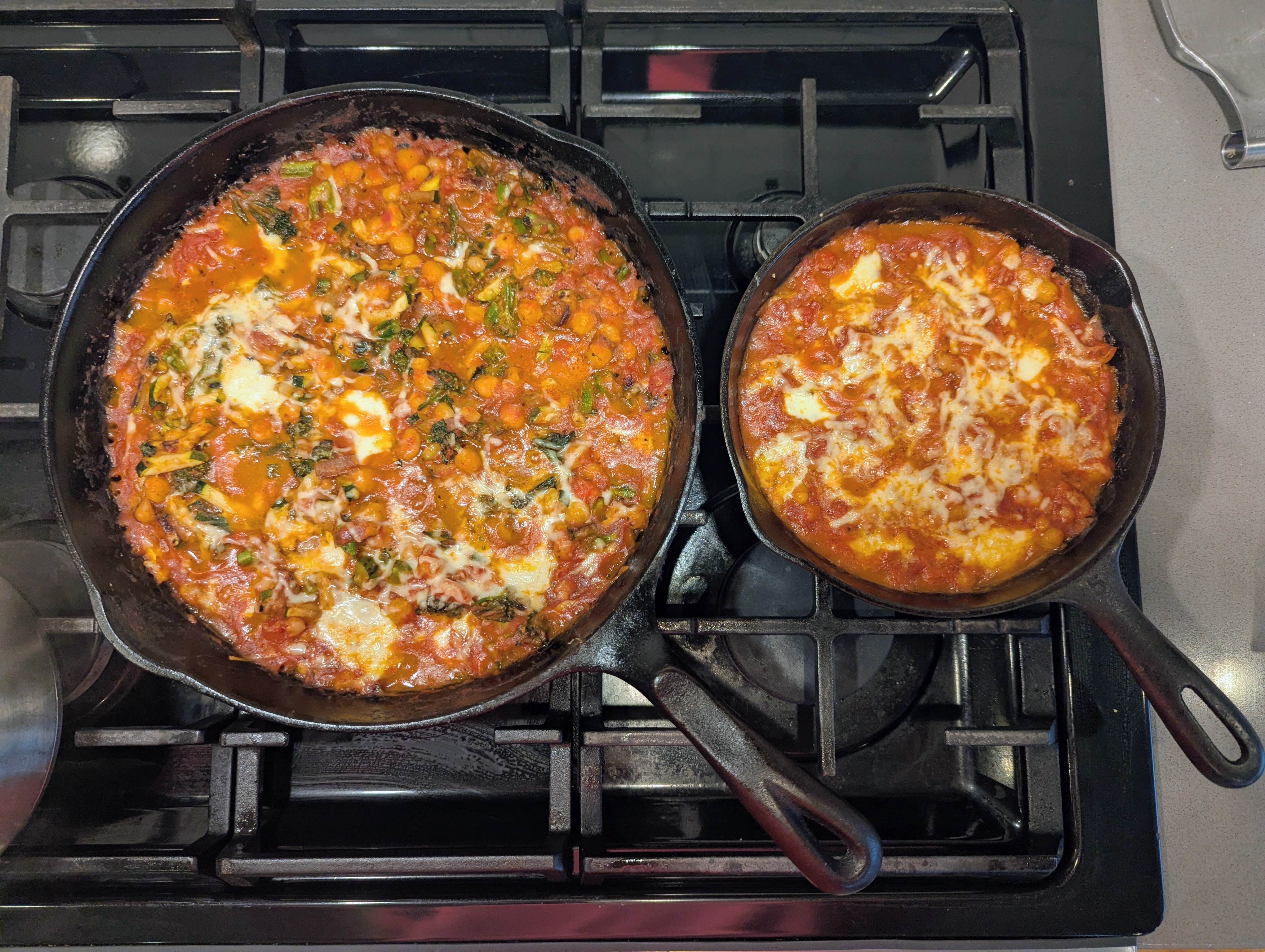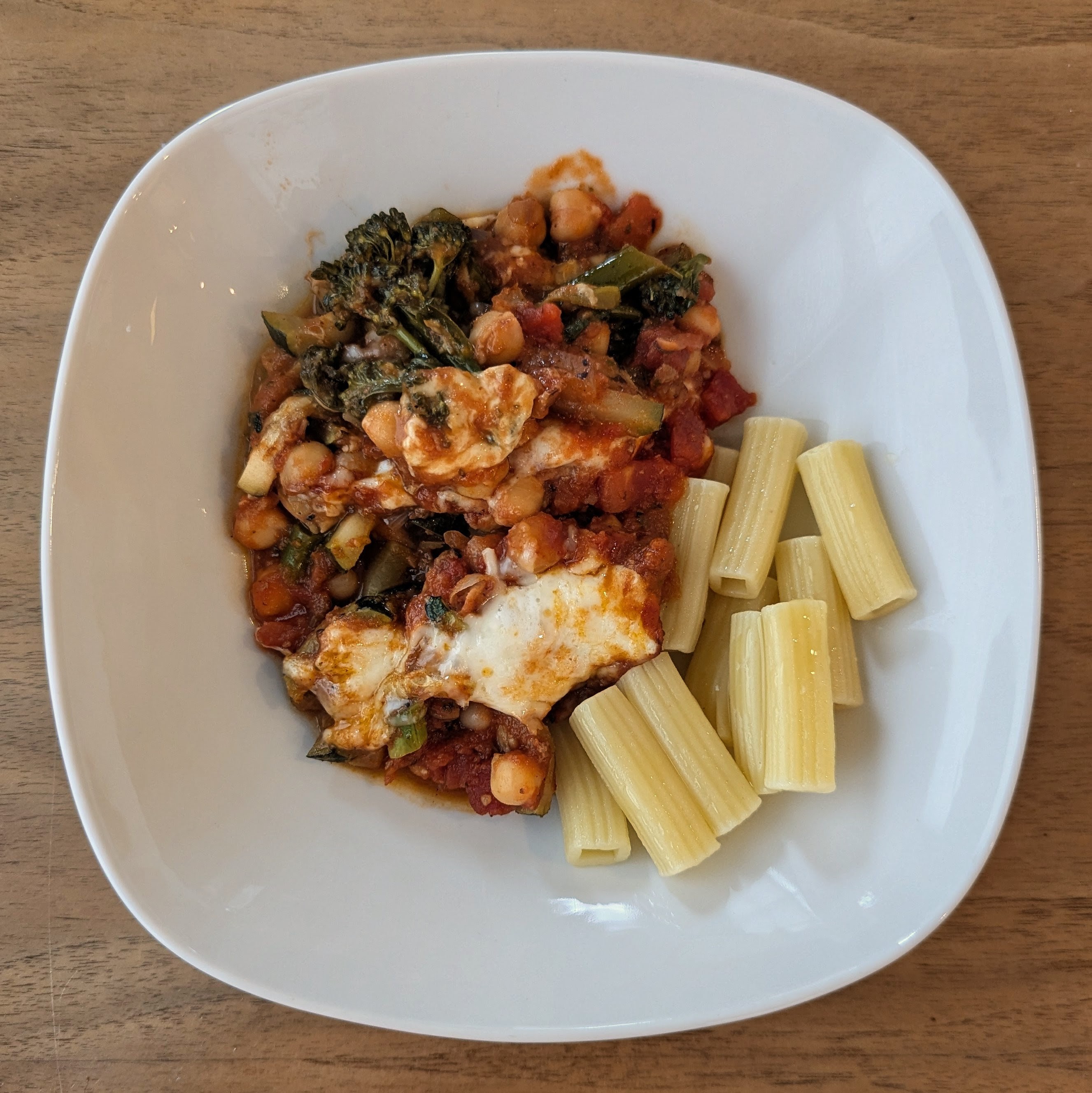 Tonight I made pizza beans with homemade marinara and TJ’s jarred Bolognese, chickpeas and white beans, seared chopped broccolini and julienned zucchini, fresh mozz, and red pepper flake. Hit the spot.