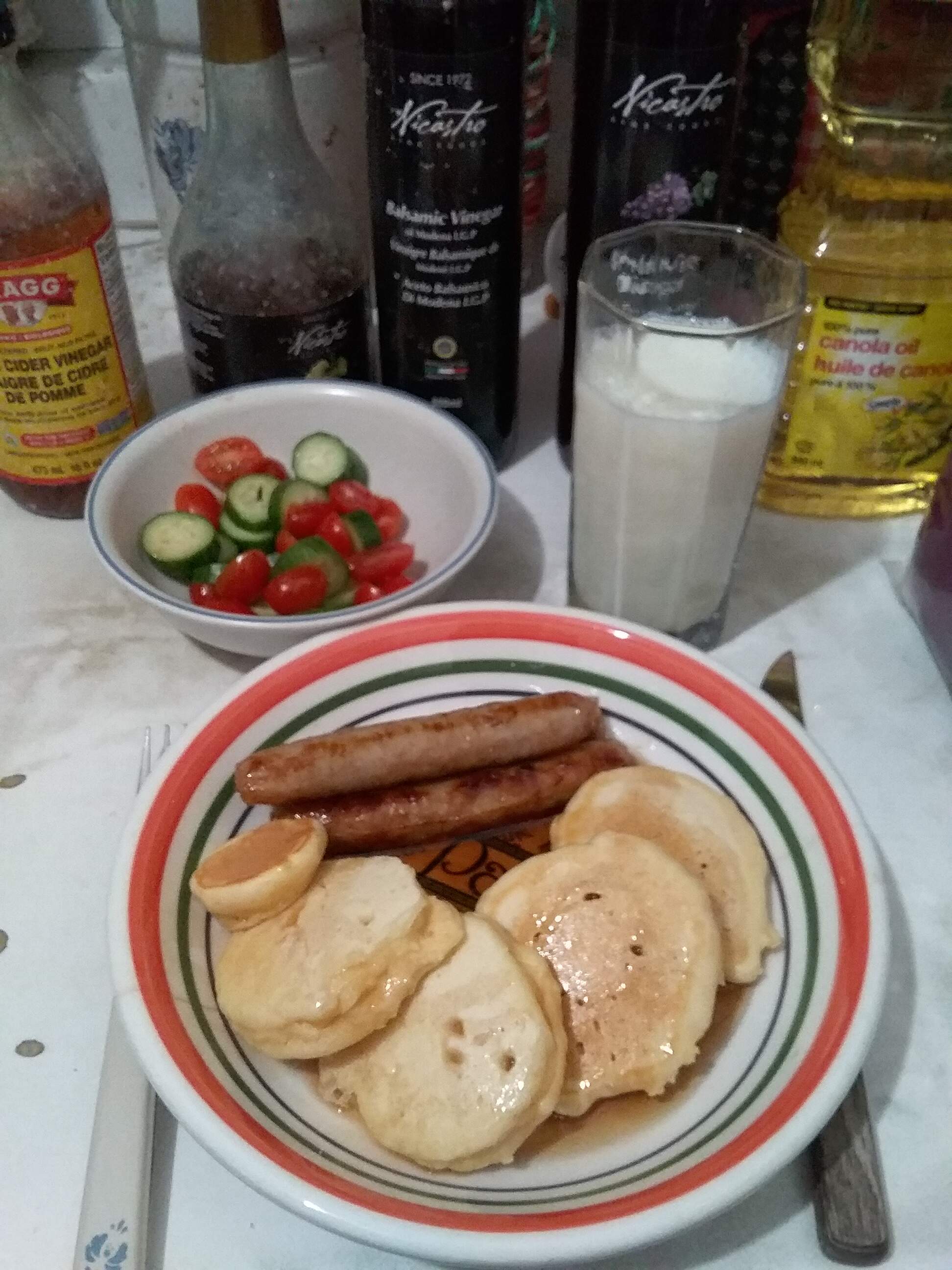 Last night’s shrove Tuesday dinner included pancakes, honey pork breakfast sausages and a tomato cucumber salad. I think they forgot to put honey in the honey sausages ![]()