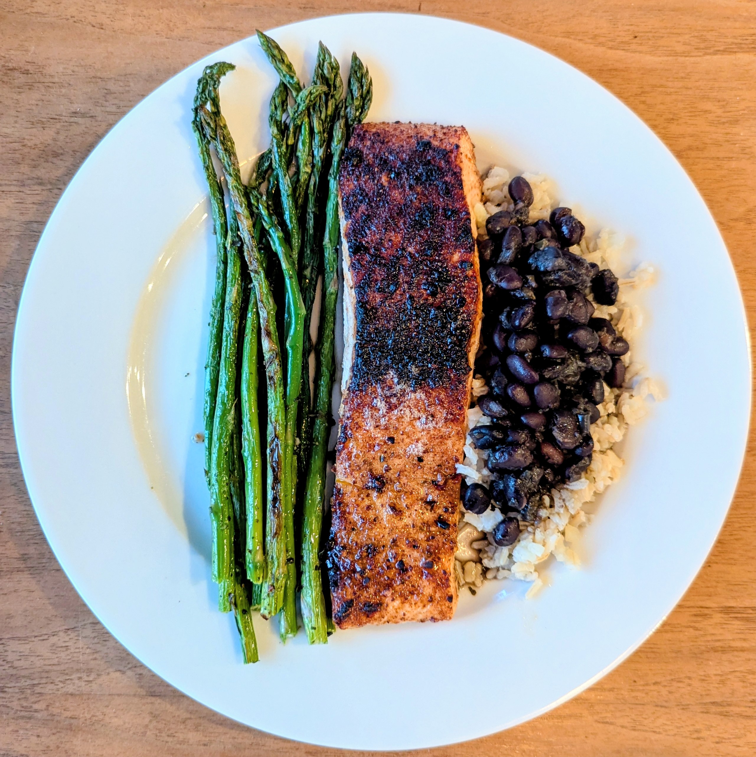 Blackened broiled salmon, homemade Cuban black beans over cauli-brown rice, roasted asparagus, and green salad. Easy and good.