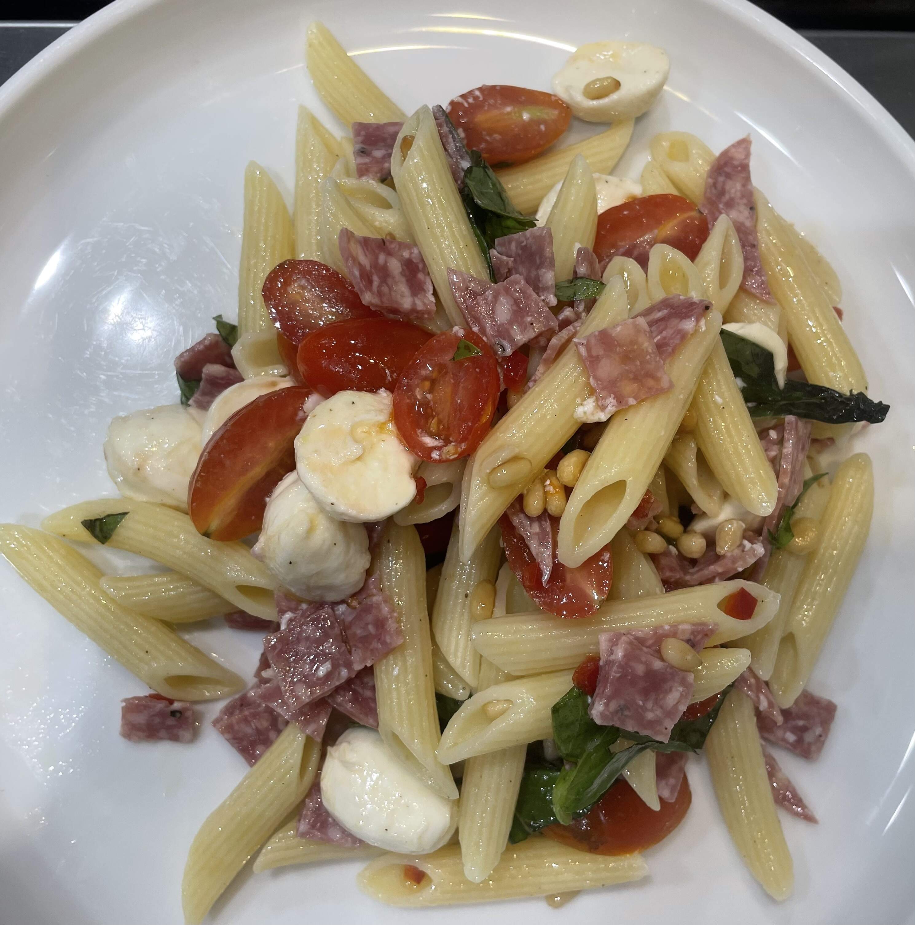 Pasta Salad Caprese - penne, cherry tomatoes, mozzarella, salami, basil, fresno chili with a vinaigrette made with olive oil, lemon juice, pasta water and a pinch of sugar. Topped with some toasted pine nuts