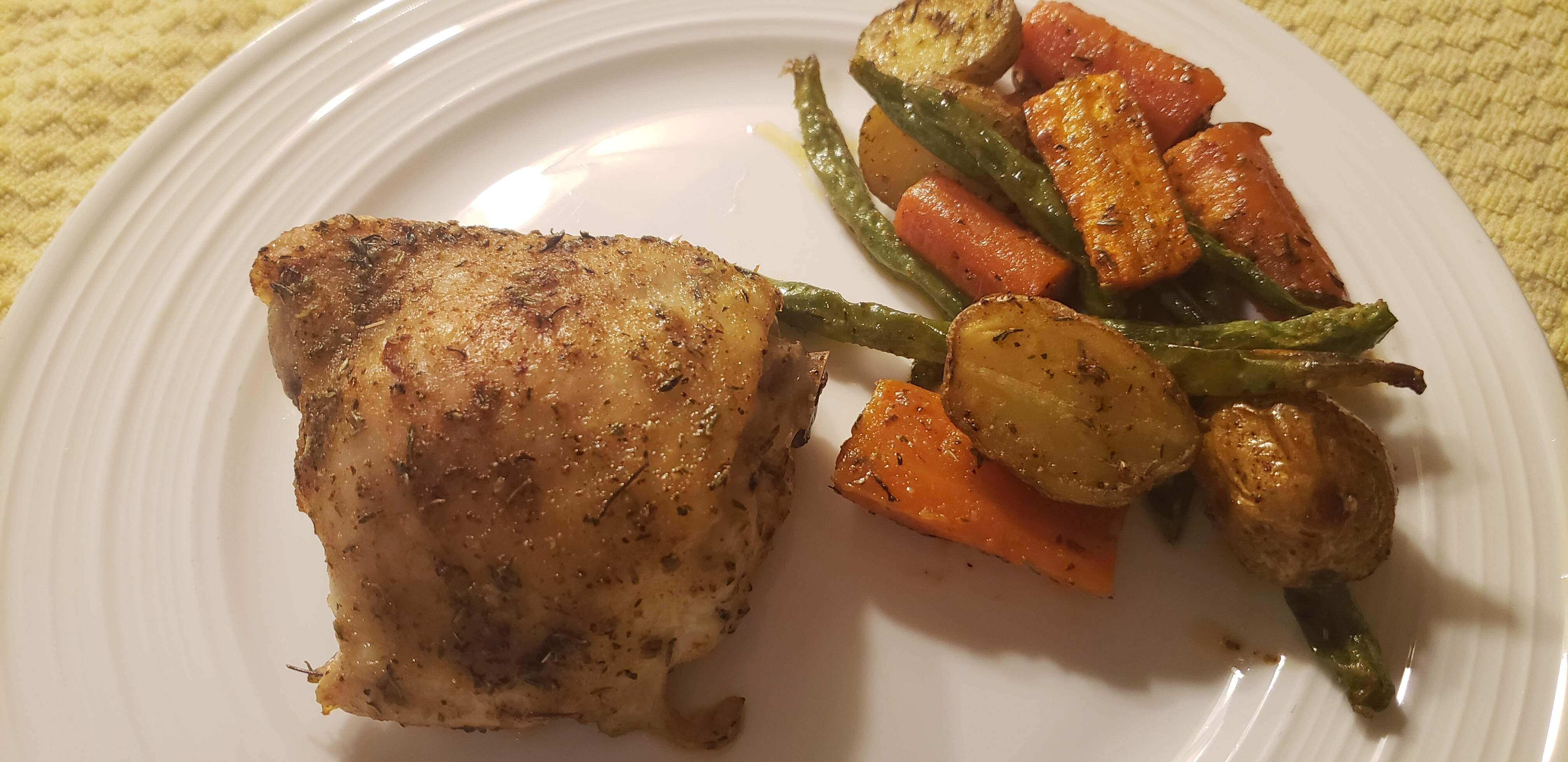 Went with easy sheet pan chicken and veg tonight, tossed in a combo of olive oil, s/p, paprika, granulated garlic and onion powders, Italian seasoning and extra thyme. Roasted at 400° for about 40 minutes until the chicken was at 165° internal temp.