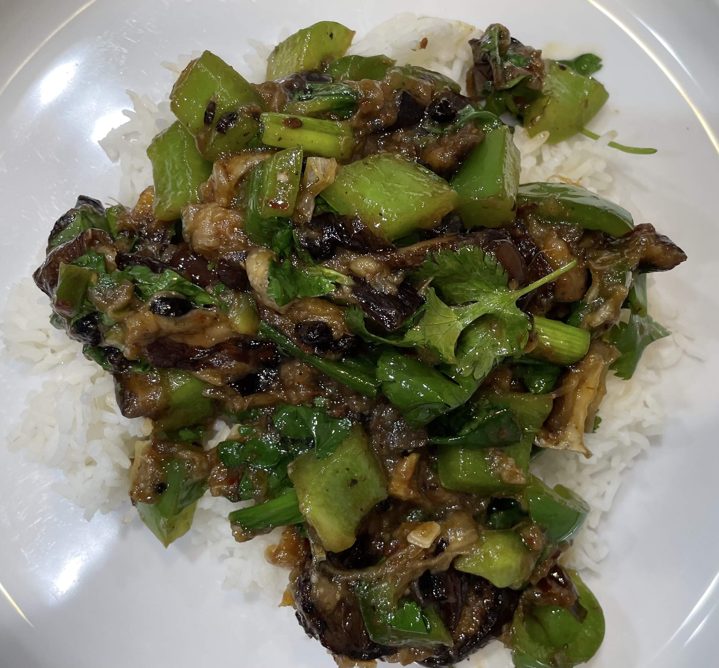 Eggplant with Black Bean Sauce from “A Very Chinese Cookbook” - japanese eggplant gets precooked in the microwave before stir-fried with green bell peppers and scallions greens and mixed with a sauce made from slowly simmering sliced garlic, ginger, sichuan chili flakes and star anise and once cooled combining with hoisin, Shaoxing wine and douchi. Finished with scallions whites and cilantro and served over rice