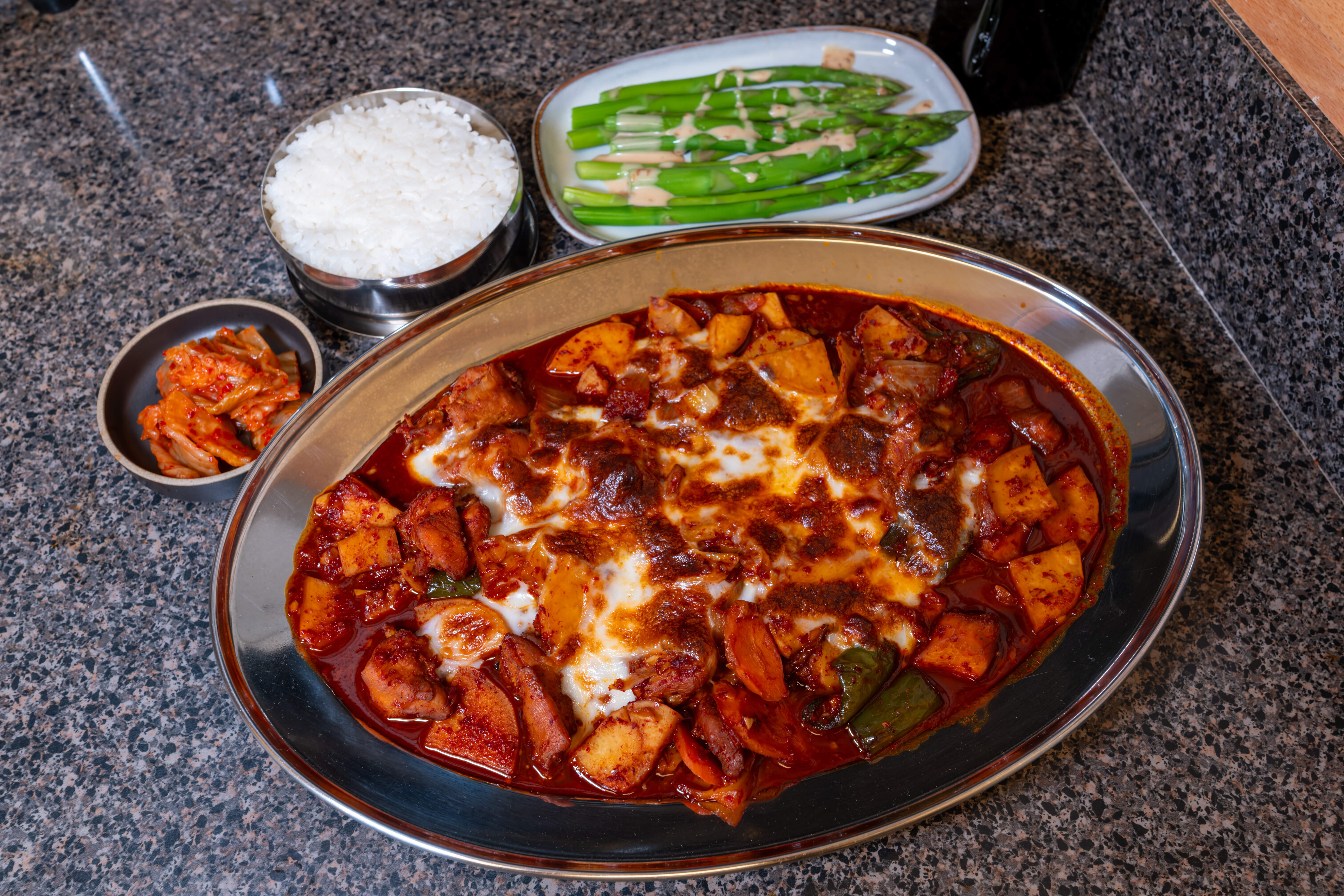 Served with a baked chicken thigh , salad , and beans . Cheers.