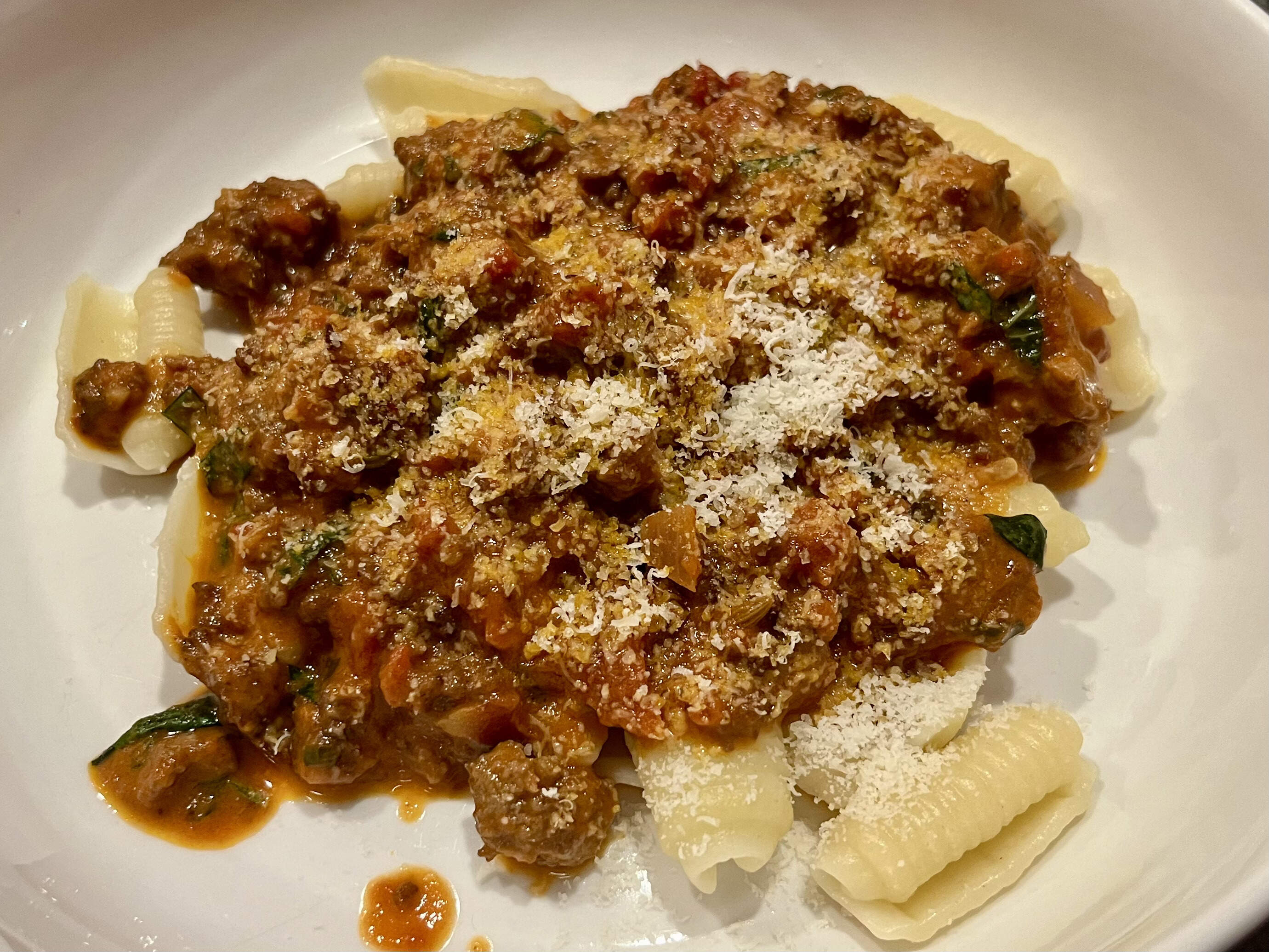 ), Aldi’s “speshully select” marinara we pimped with local ground lamb from the freezer & 2 Italian snossidges (1 sweet, 1 hot) I didn’t use for the Tuscan soup, half a chopped red onion from the crisper, a lil tomato paste, a coupla crushed garlic cloves, splash o’ Tempranillo, a lonely roasted red pepper from a jar in the fridge, a glug of local heavy cream, and some fresh basil. Parm showered over the top. Couldn’t be arsed to make a salad tonight.
