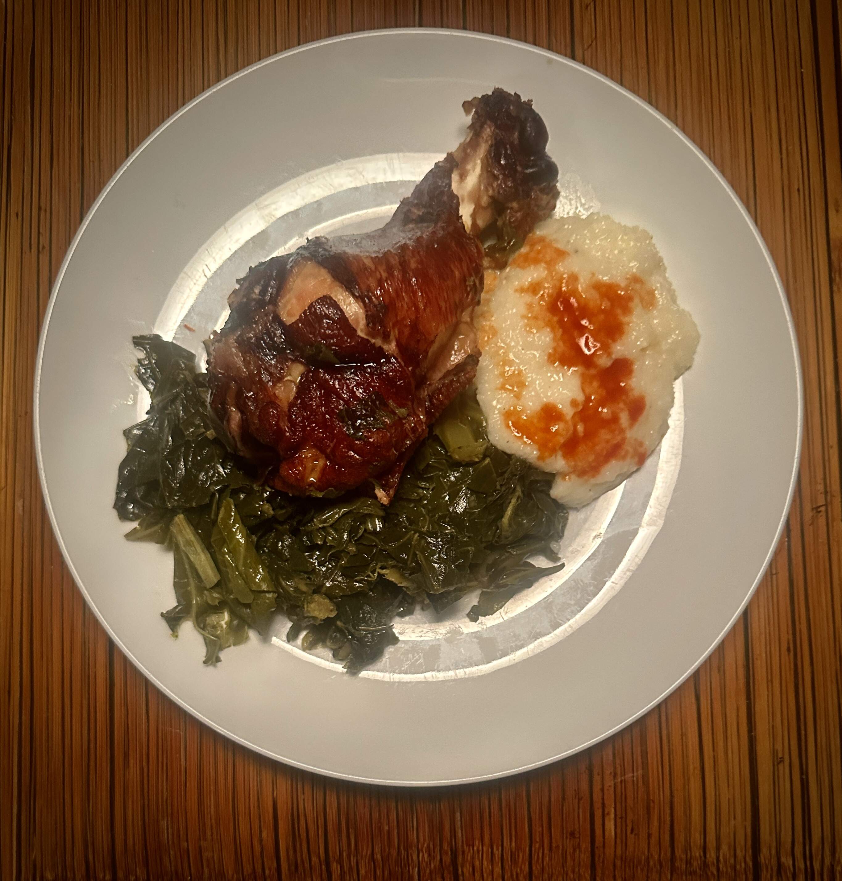 Collard greens cooked with smoked turkey. Served with grits and cheese and lots of hot sauce. I started making collard greens a long time ago when I didn’t eat beef or pork. Even though I do eat them now, I still always use turkey.
