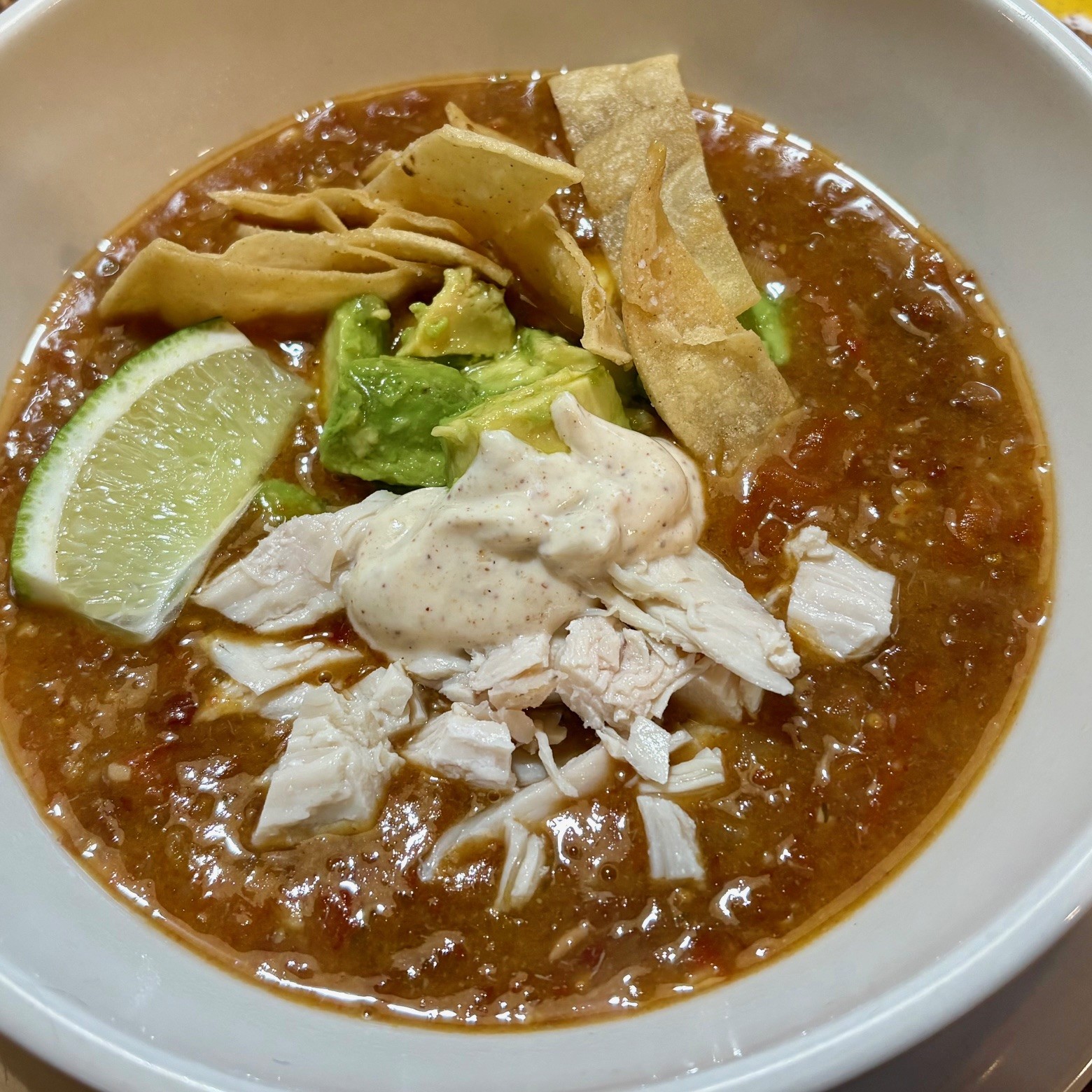 Spicy Tex Mex bean soup with shredded chicken, avocado, and a habanero-yogurt crema. Tortilla chips on the side.
