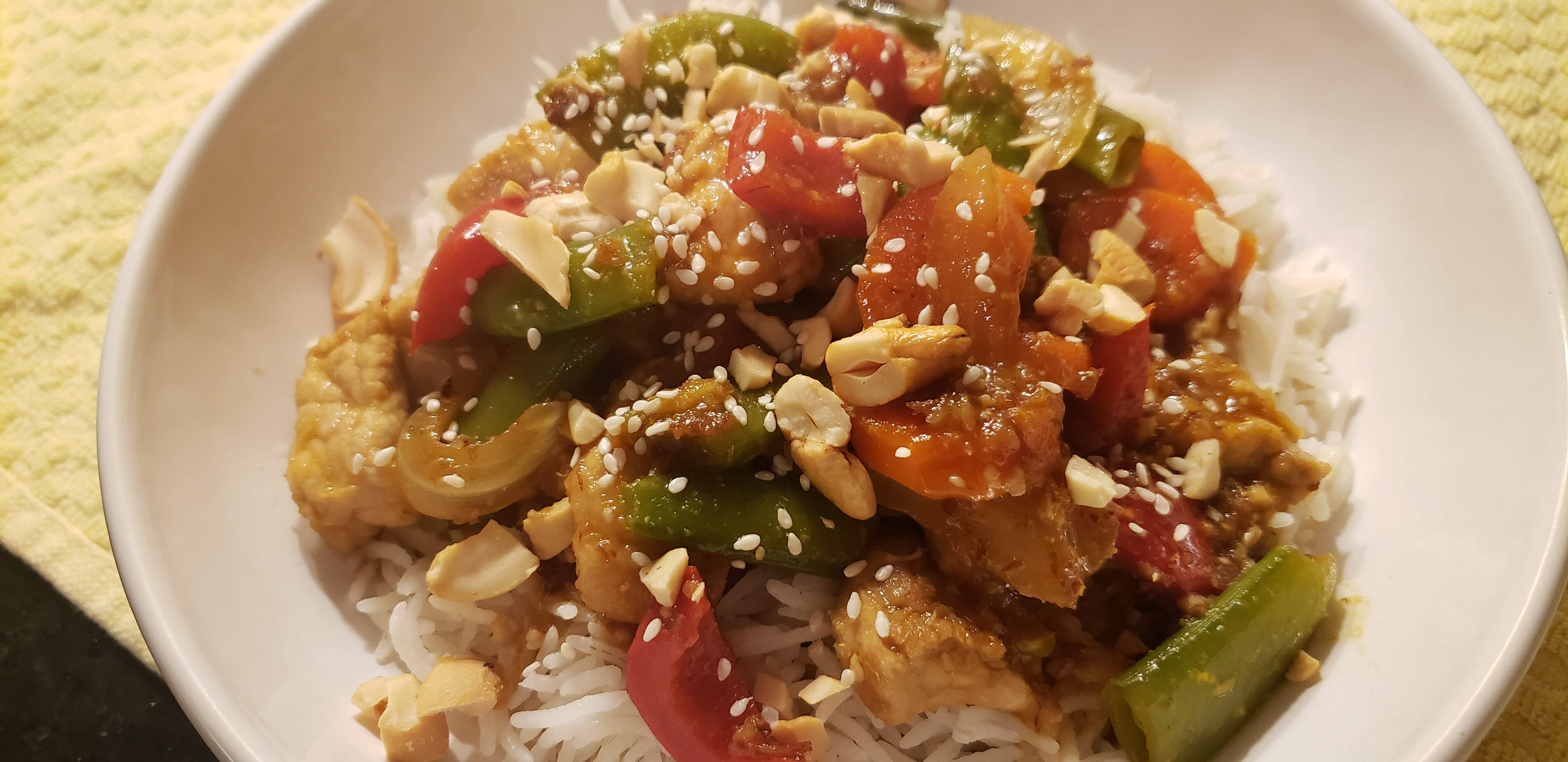 Boneless pork chop, sliced thinly, and had sliced carrots, sugar snap peas, red bell pepper and onions as the veg. Needed WAY more ginger than called for (I even added ground ginger and it was “less than” I’d prefer).