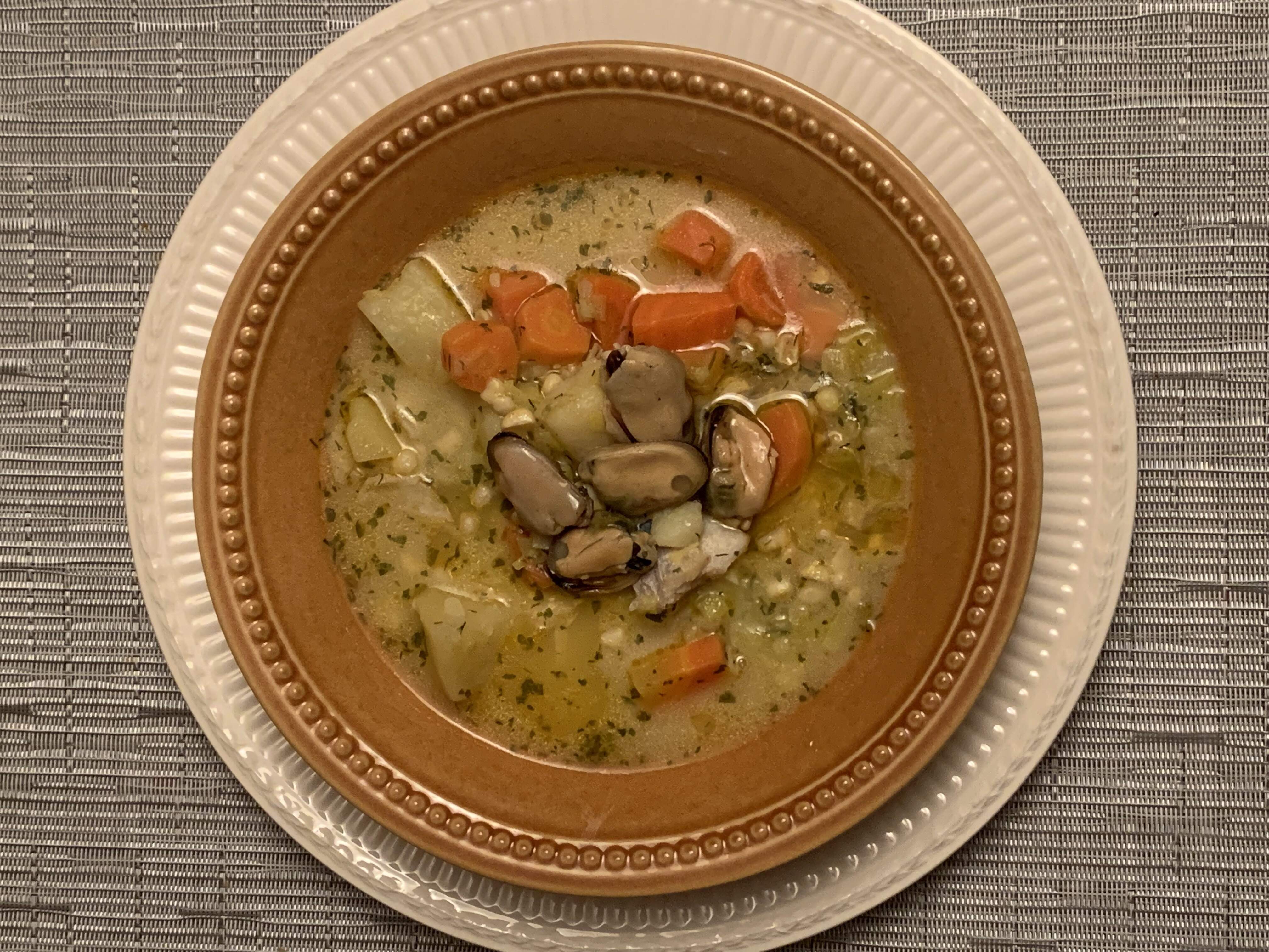 Haddock chowder, using the last of the summer corn I had squirreled away in the freezer. Topped with smoked mussels.