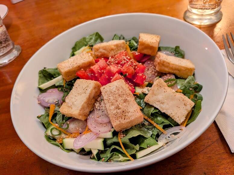 and tonight’s din-din - BF made me a salad as big as my head, with crispy tofu and all the fixings, including Thai basil we had, with a rice vinegar/sesame oil vinaigrette. Leftover tofu squares for snacking on later.