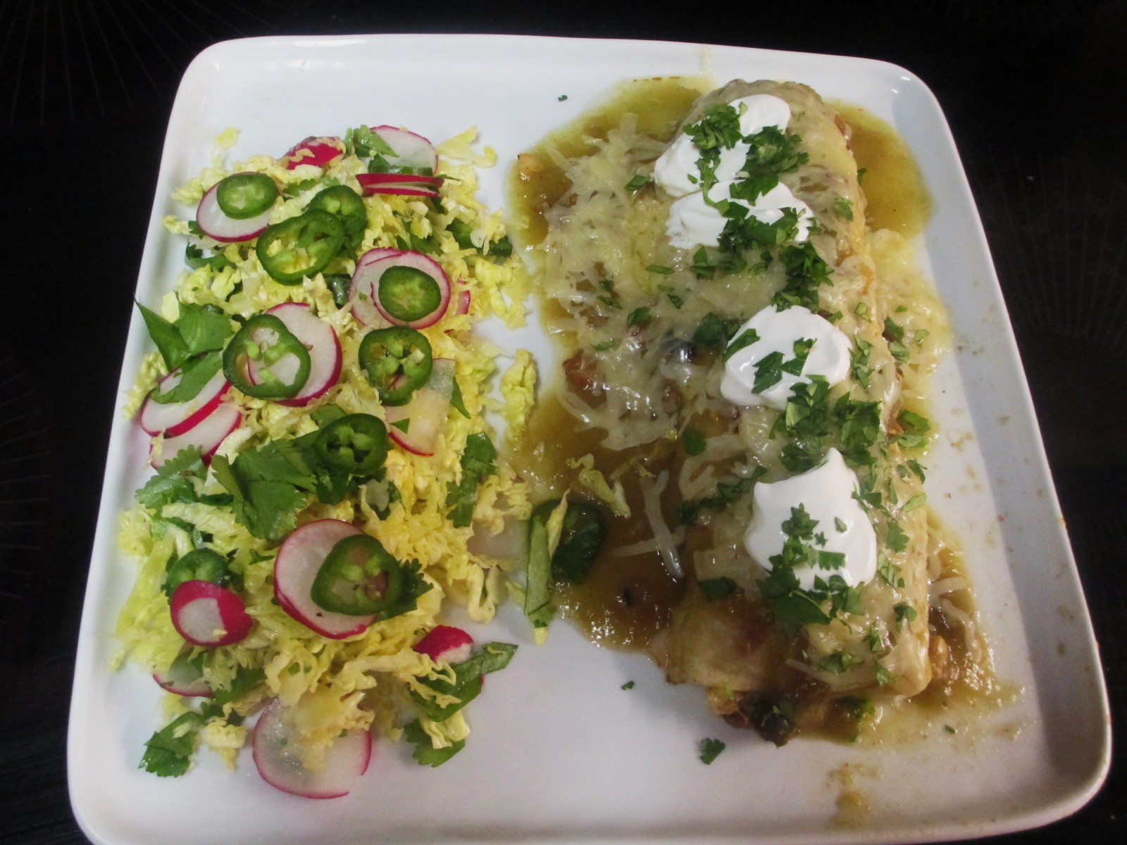 Chicken enchilada, salsa verde, jack cheese, sour cream, cilantro. Savoy cabbage, cilantro, radish, jalapeño, oo & lime juice salad. Enchilada and sauce from the freezer. I had a Margarita.