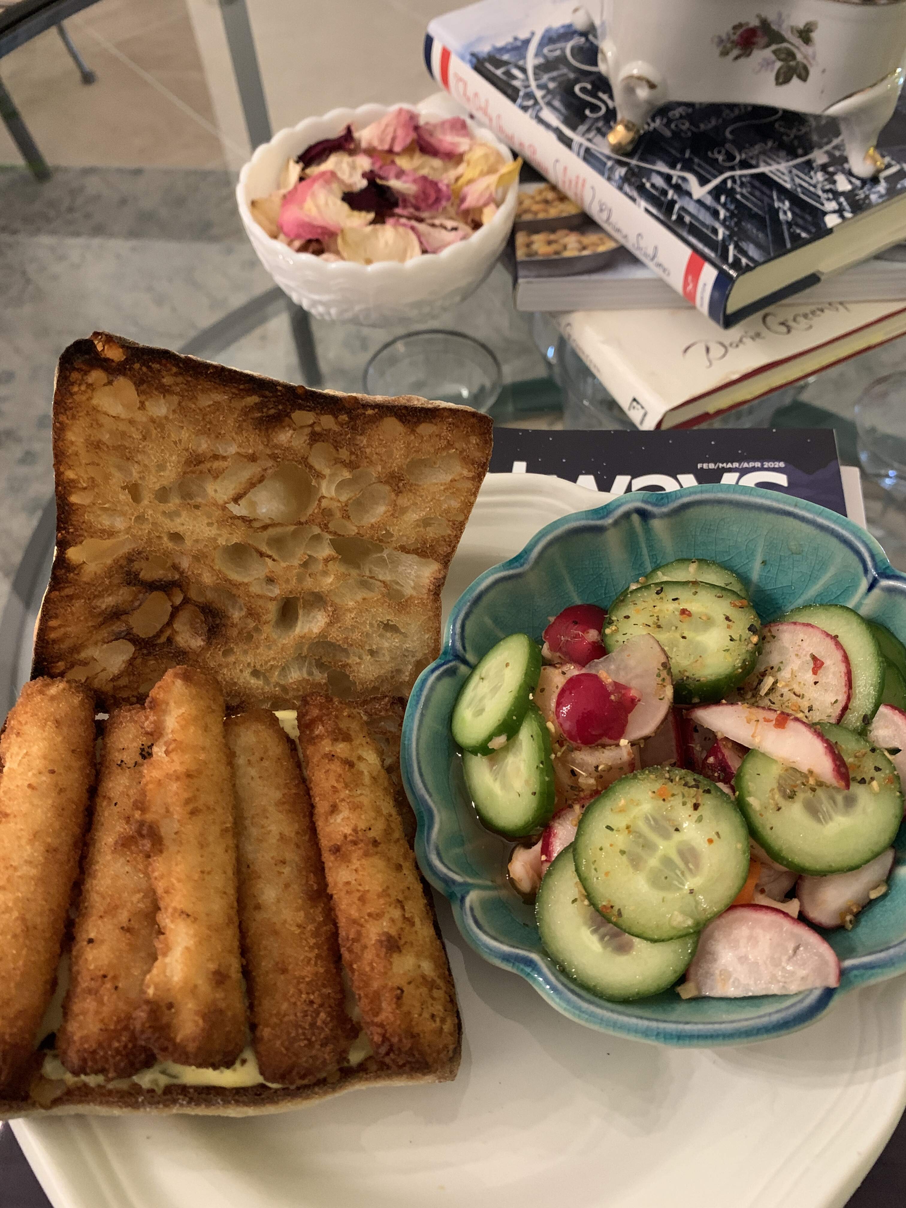 Gorton’s fish sticks with mustardy tartar on a Trader Joe’s ciabatta roll. Pickled vegetables.