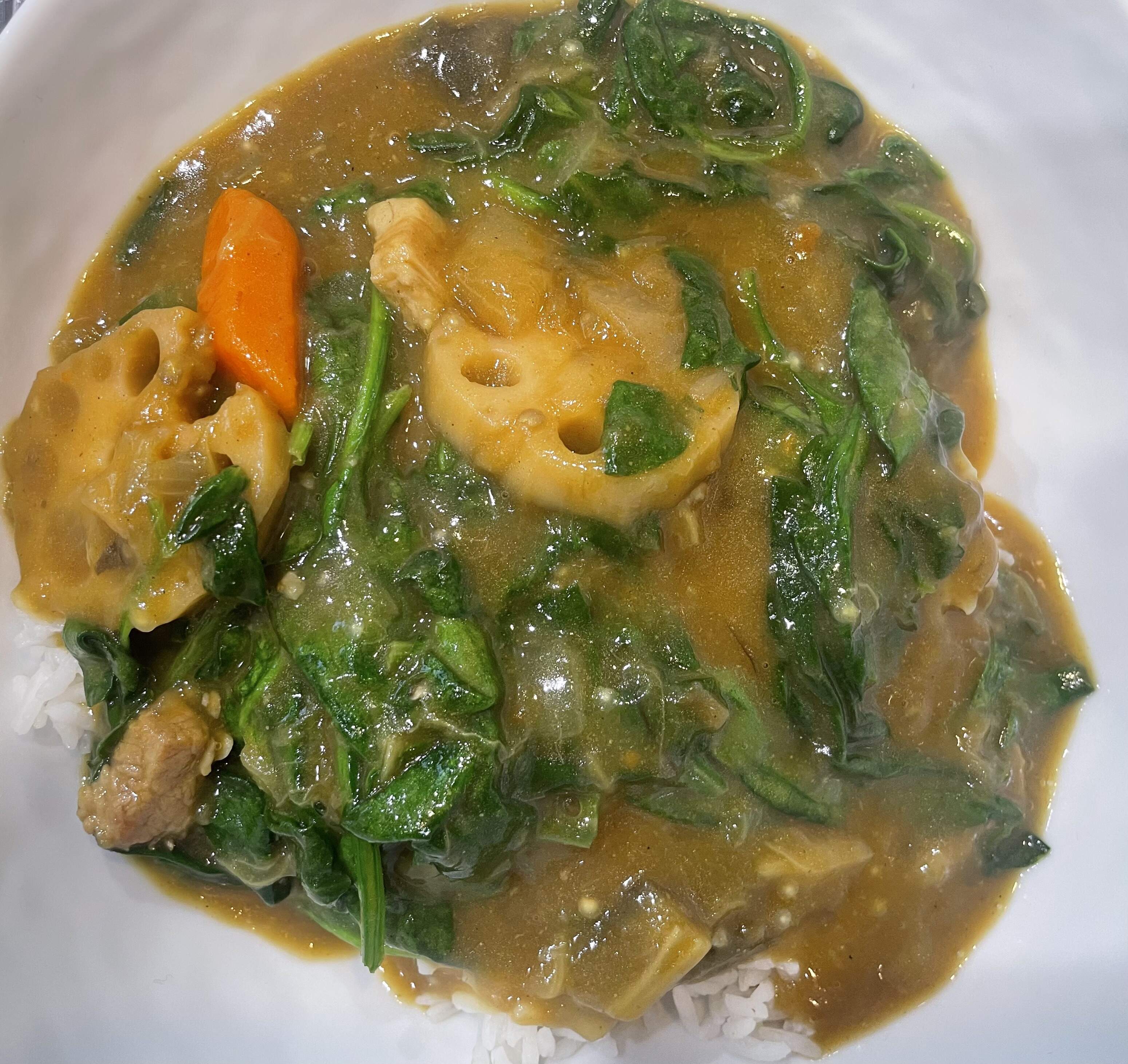 Weeknight Curry Rice with Eggplant, Spinach, and Lotus Root from “Korean American” by Eric Kim - Korean/Japanese inspired curry where you stew pork belly, eggplant, carrots, lotus root and onions for an hour and afterwards add a slurry of instant curry mix (Golden Curry) and baby spinach. Served over rice