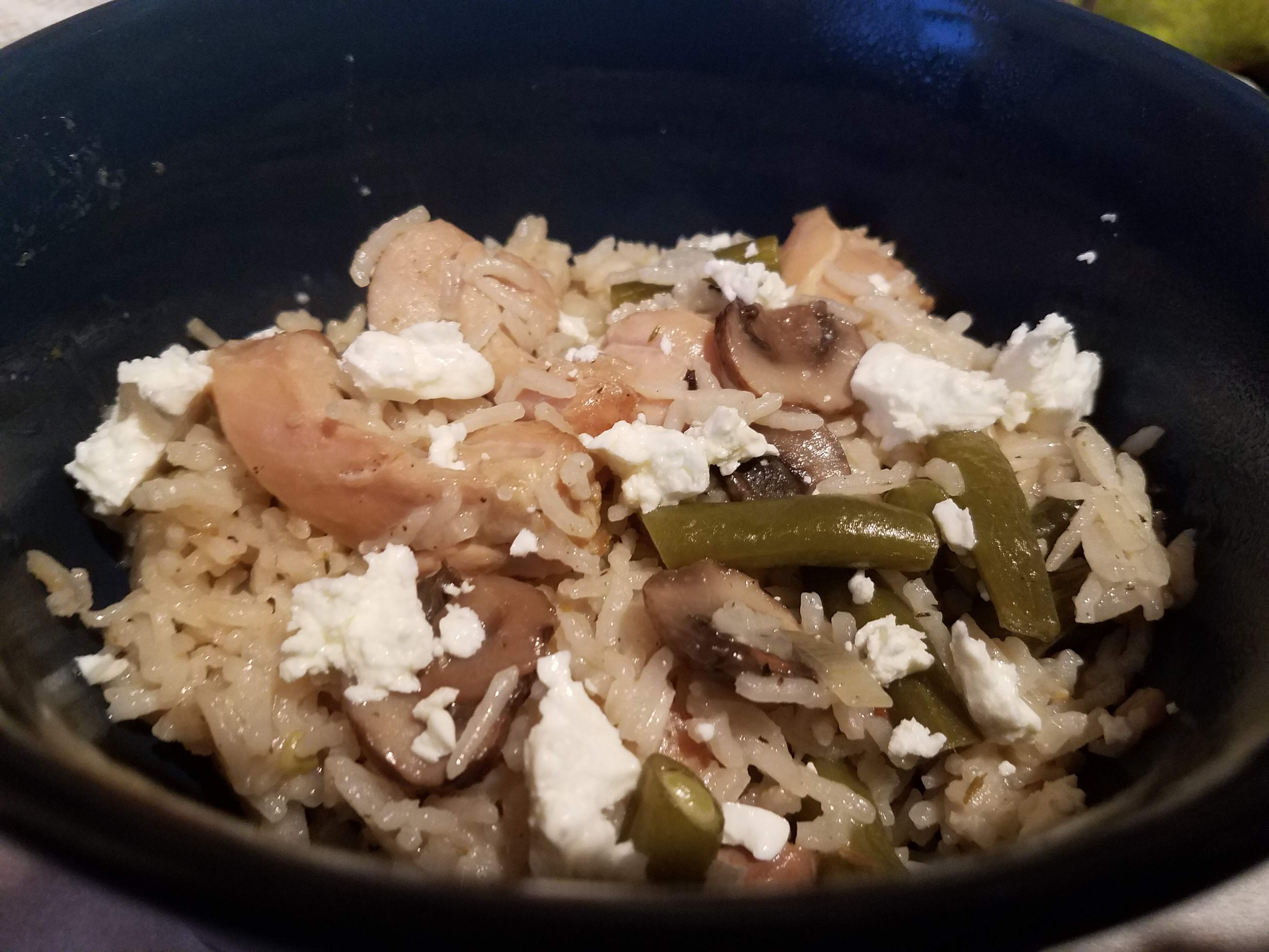 I’m on a “low fiber” diet for a medical procedure in a couple of days, so I cooked up some Greekly seasoned chicken and white basmati rice, with mushrooms and green beans (somehow considered low fiber on the diet list), and feta. It’s the first time I’ve cooked white rice in forever, but it worked out well, not sticky at all. Biryani next time?