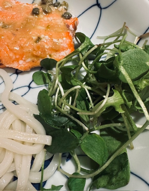 Tonight, I oven-roasted a large fillet and topped it with a piquant lemon caper sauce. B got a leftover baked potato and organic local farmstand salad dressed with green goddess and Spring onion got udon noodles and undressed organic local claytonia (a delightful nutrient-dense micro green that he sampled and loved at the farmstand this past weekend) as sides. My dish was some combo.