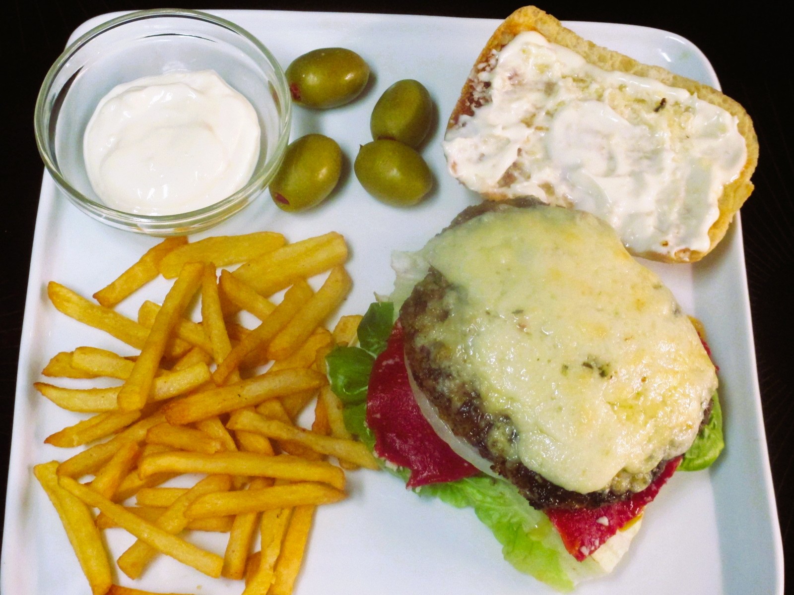 Chorizo and beef albondigas burger. Buttered and toasted ciabatta roll slathered in aioli, little gem, roasted piquillo peppers, sweet onion, the patty, Manchego cheese, more slathering on the top bun. Extra crispy ff fries, more aioli for dipping and a few Spanish queens.