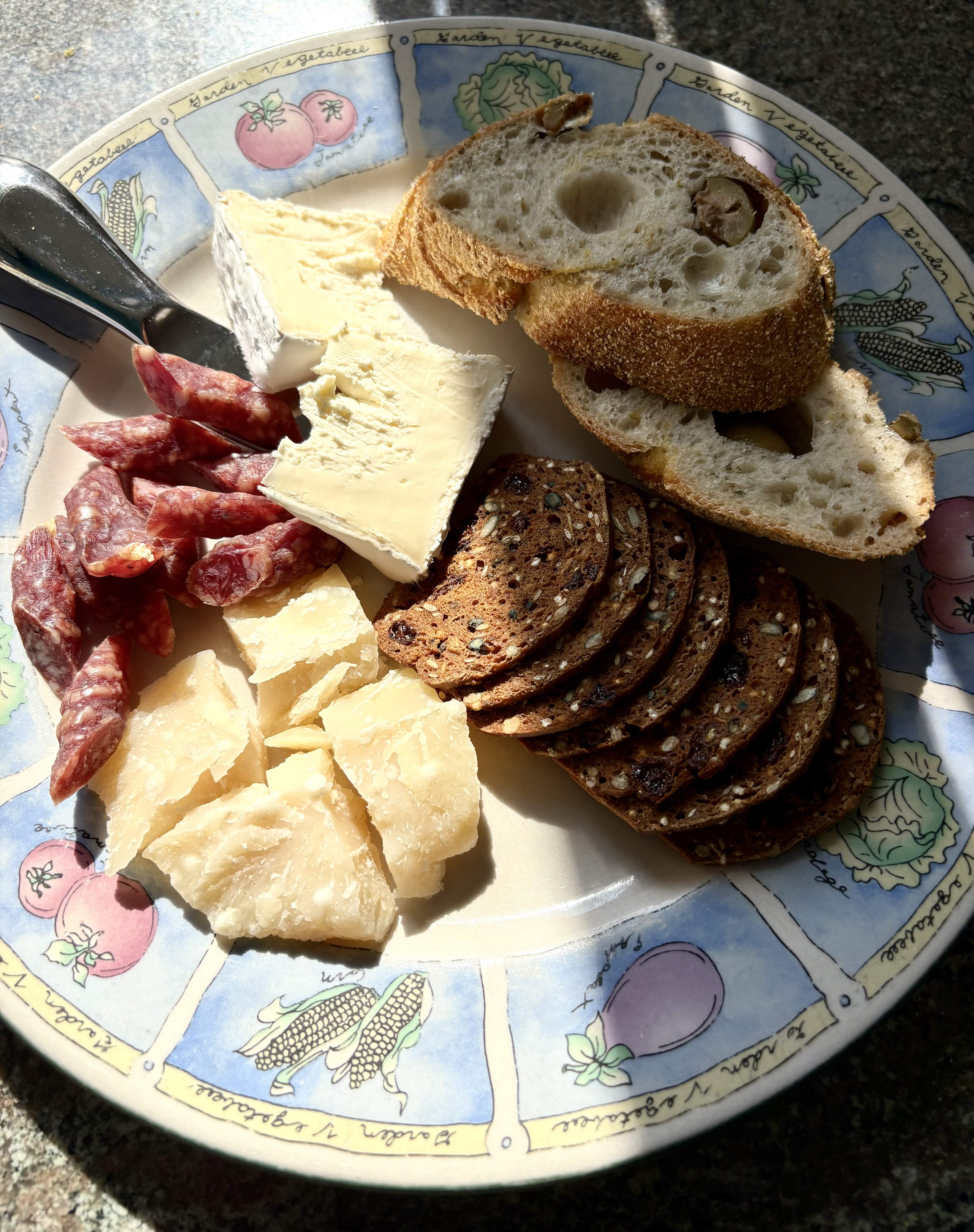 Some Saint Andre triple cream cheese, Parm/Regg, fennel pepperetts, deliciously fresh corn and olive batard and some raisin/rosemary “rainforest” crackers.