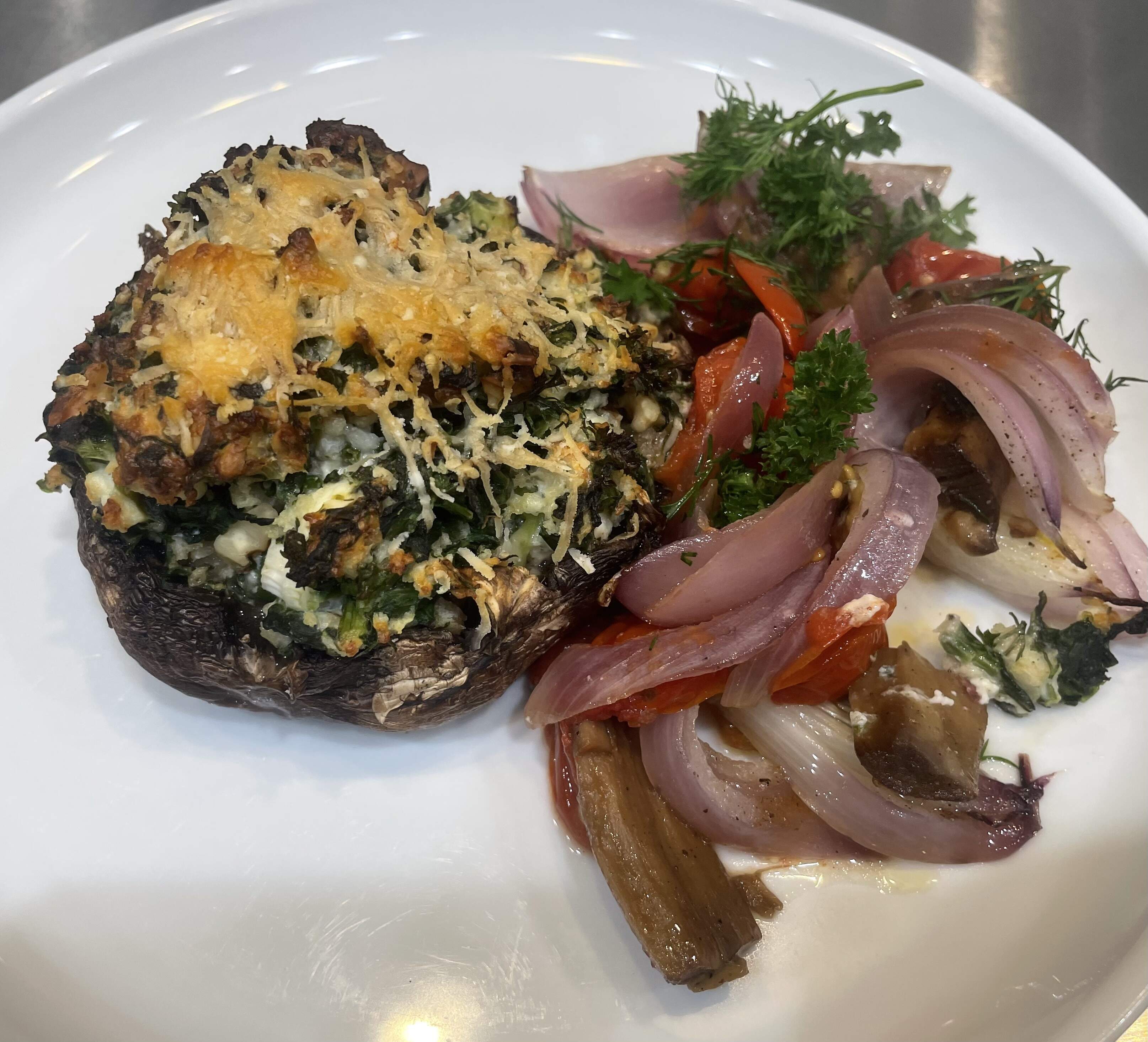 Spinach and Herb-Stuffed Mushrooms with Blistered Cherry Tomatoes and Onions based on an ATK recipes - portobello mushrooms are filled with a mix pf chopprd spinach, feta, ricotta, parmesan, panko breadcrumbs, walnuts, scallions, egg, dill and parsley. Topped with some parmesan and baked in the oven with cherry tomatoes and red onions.