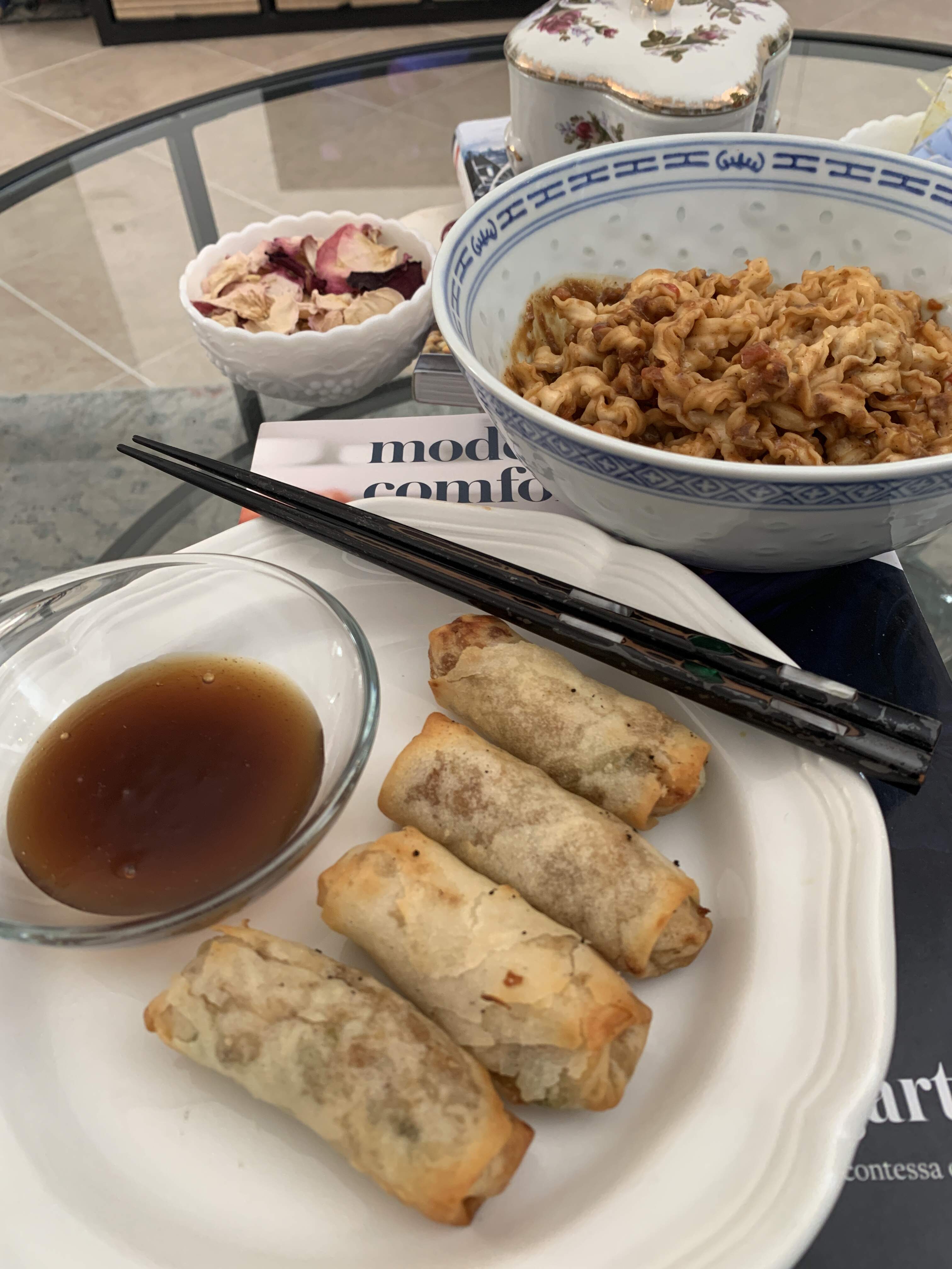 TJ noodles made per directions this time with just an added bit of chili garlic sauce and some Costco spring rolls. Beige but delicious.