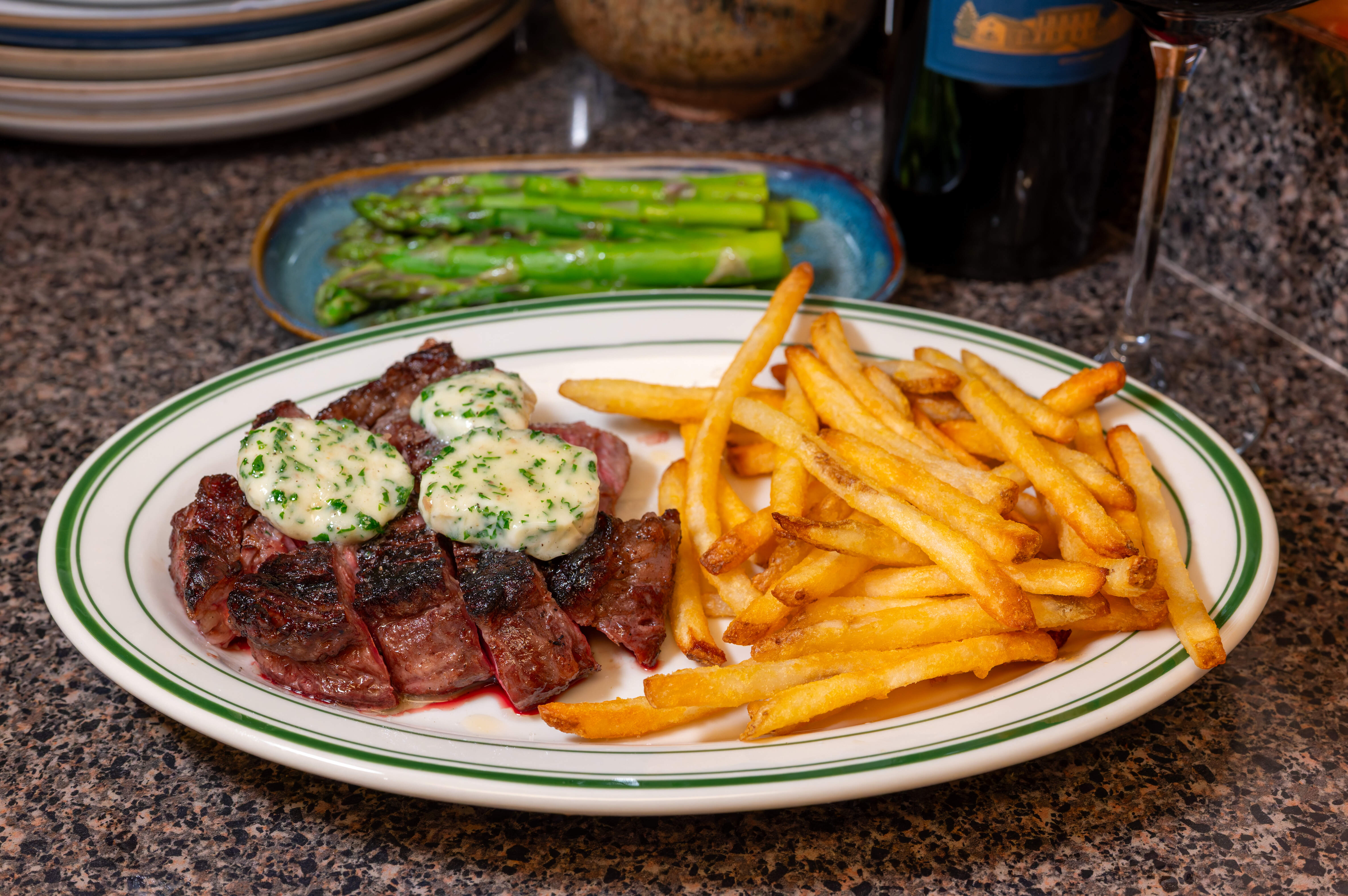 Steak with frites - ribeye cap from Costco marinated in koji overnight and reverse seared till 119F, with a anchovy garlic herb compound butter, frozen frites (Lamb and Weston shoestring cooked in the air fryer), and asparagus. A glass of Kirkland Bordeaux to drink.