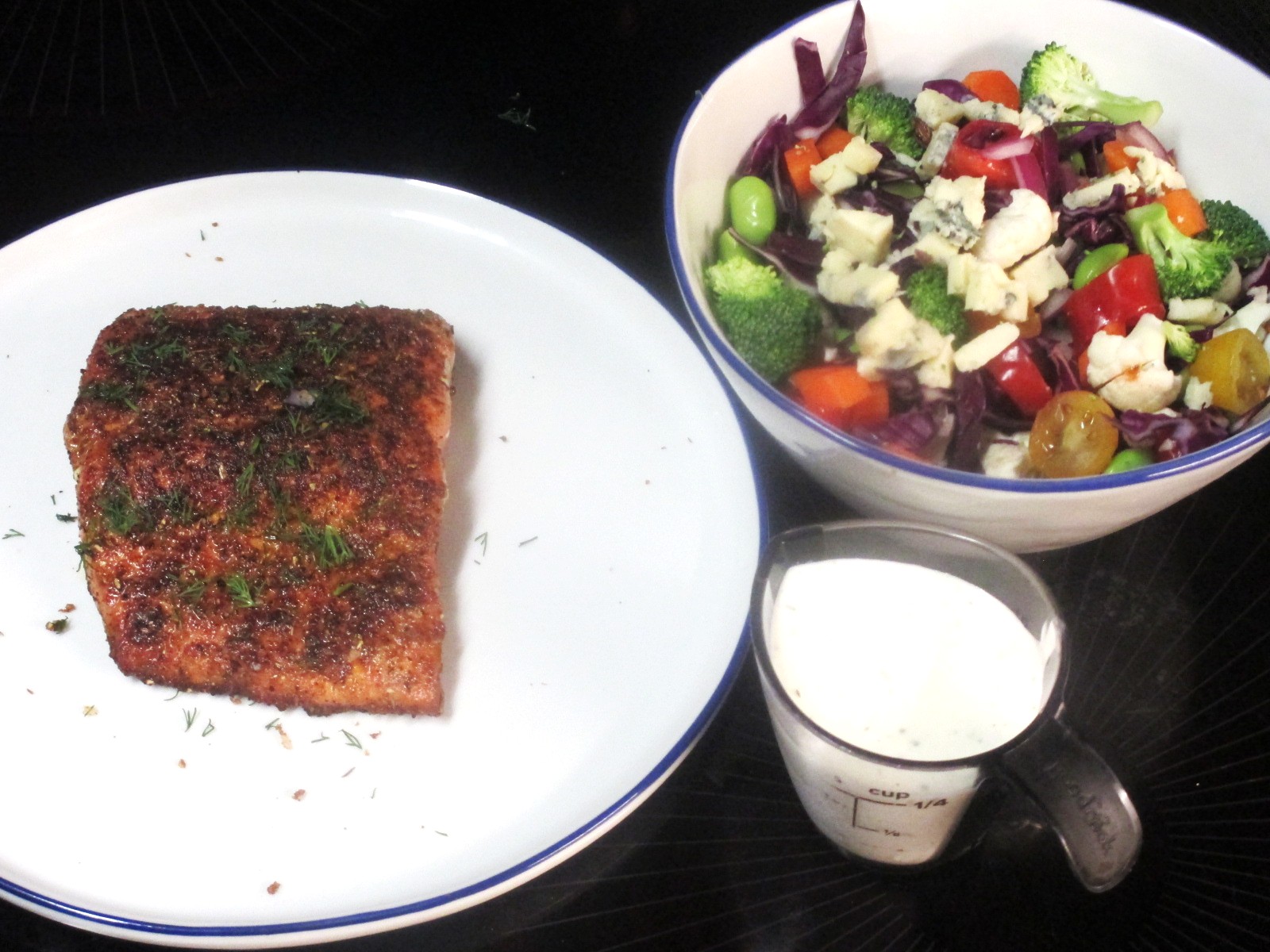 Blackened sockeye salmon; chopped salad, red onion, red cabbage, edamame, broccoli, cauliflower, carrots, cherry tomatoes, blue cheese, ranch dressing.