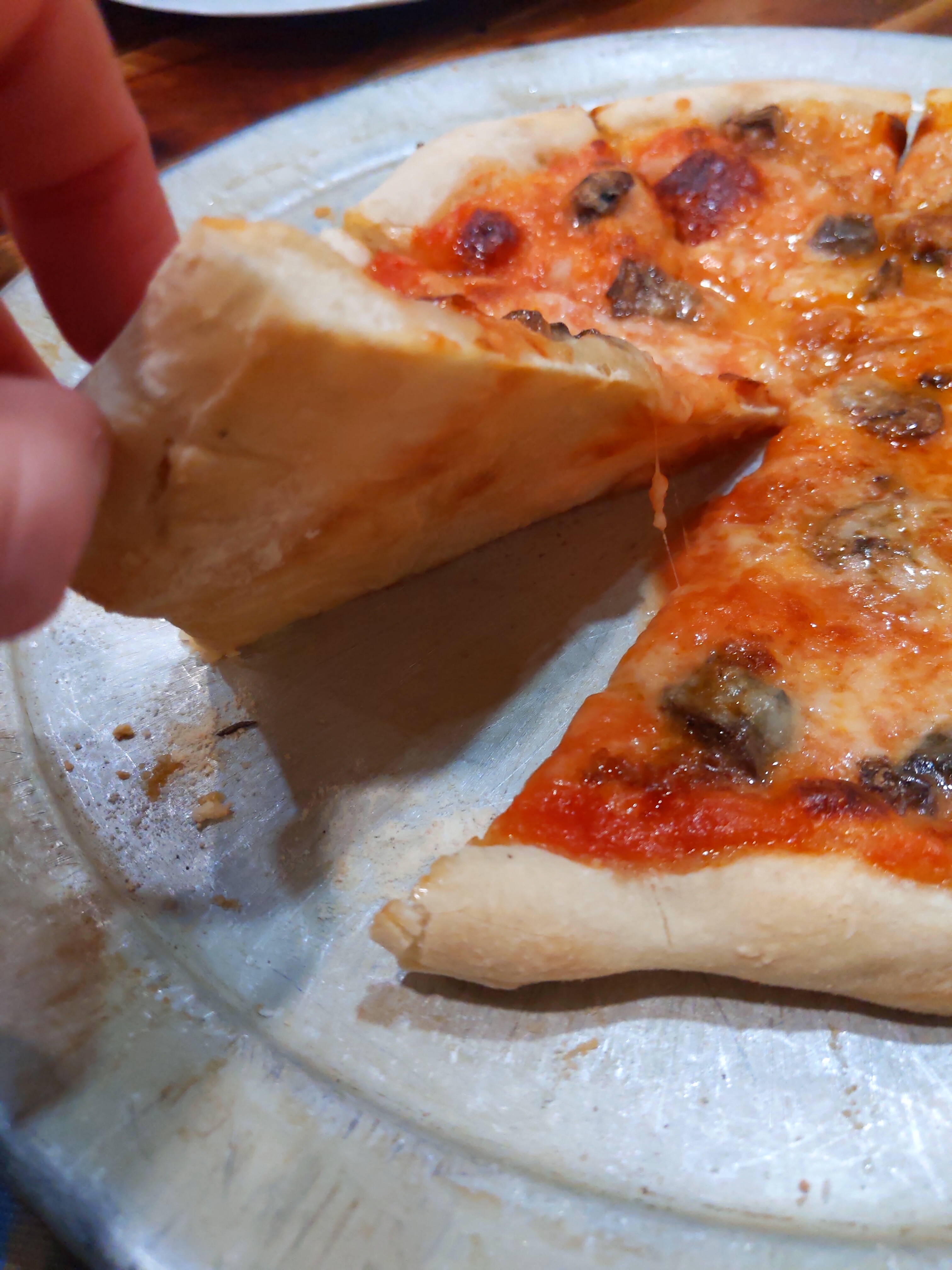 One pie had spicy Italian sausage, and the other nduja (shaved from frozen which works surprisingly well) and baby bellas.