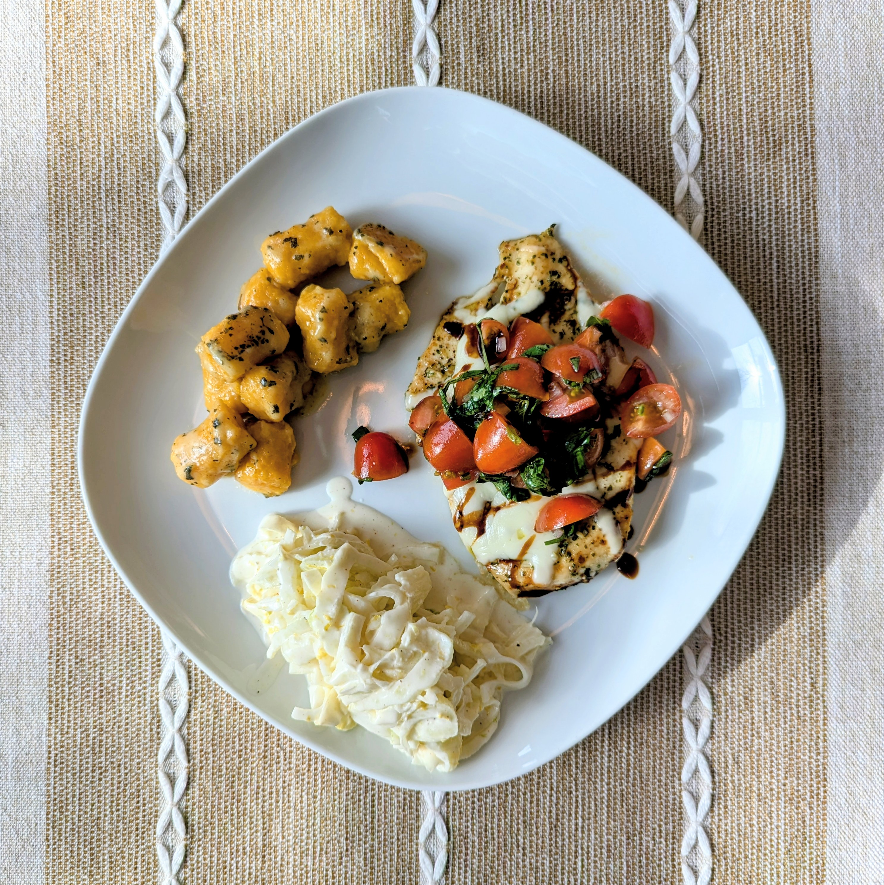 I made bruschetta chicken cutlets with TJ’s sage sweet potato gnocchi and fennel slaw with lemony yogurt dressing. The family loved the chicken’s tomato salsa. I seasoned the chicken with TJ’s aglio e oilio blend. The cheese didn’t add much and could be omitted. Might try fresh mozz next time.