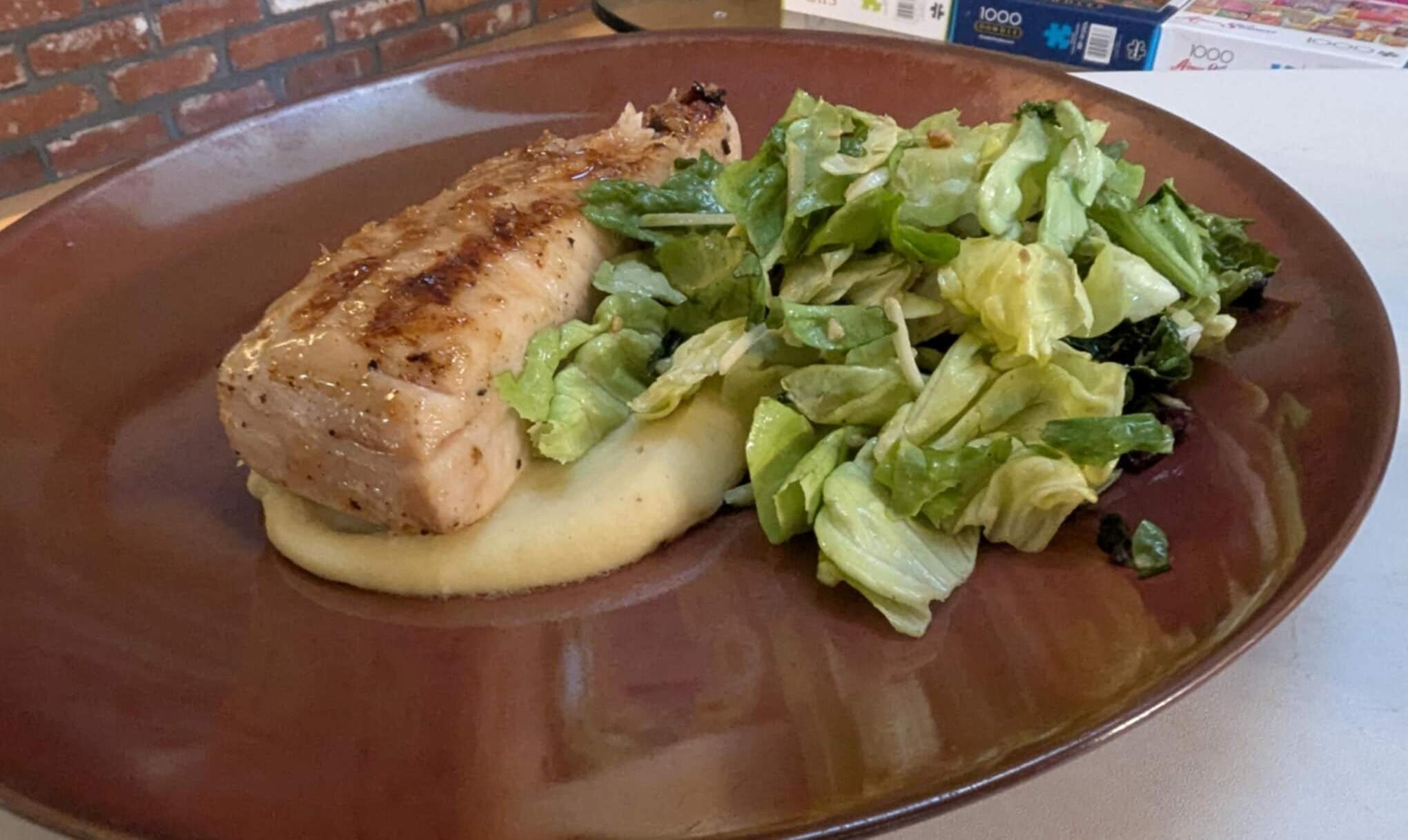 this was some grilled Opah (which we don’t find around here too often), with a fig soy glaze, whipped parsnips with ginger, greens with sesame dressing. melded well.
