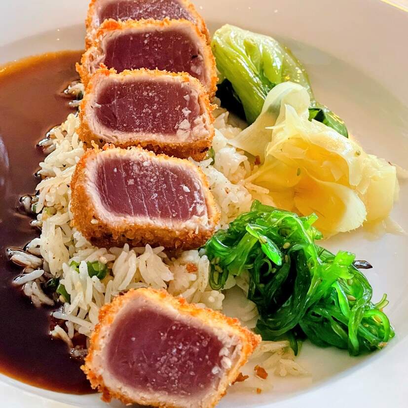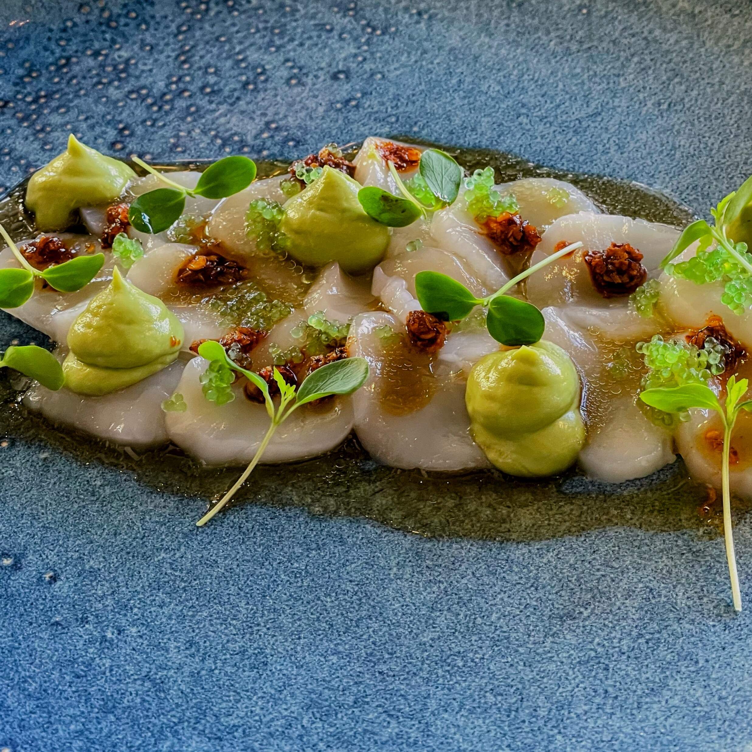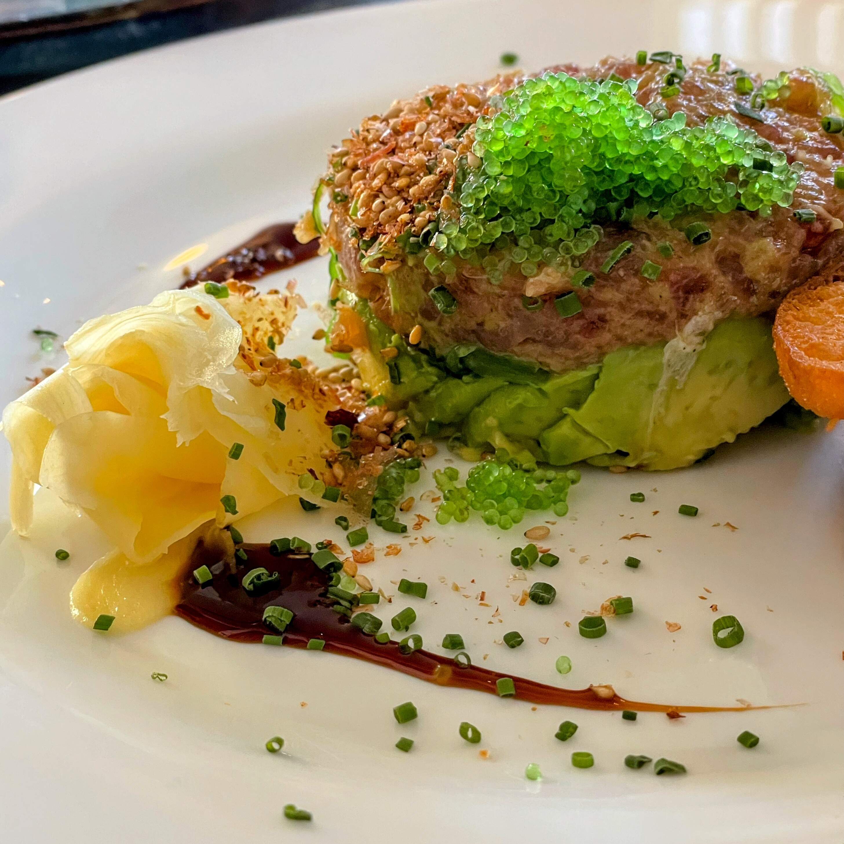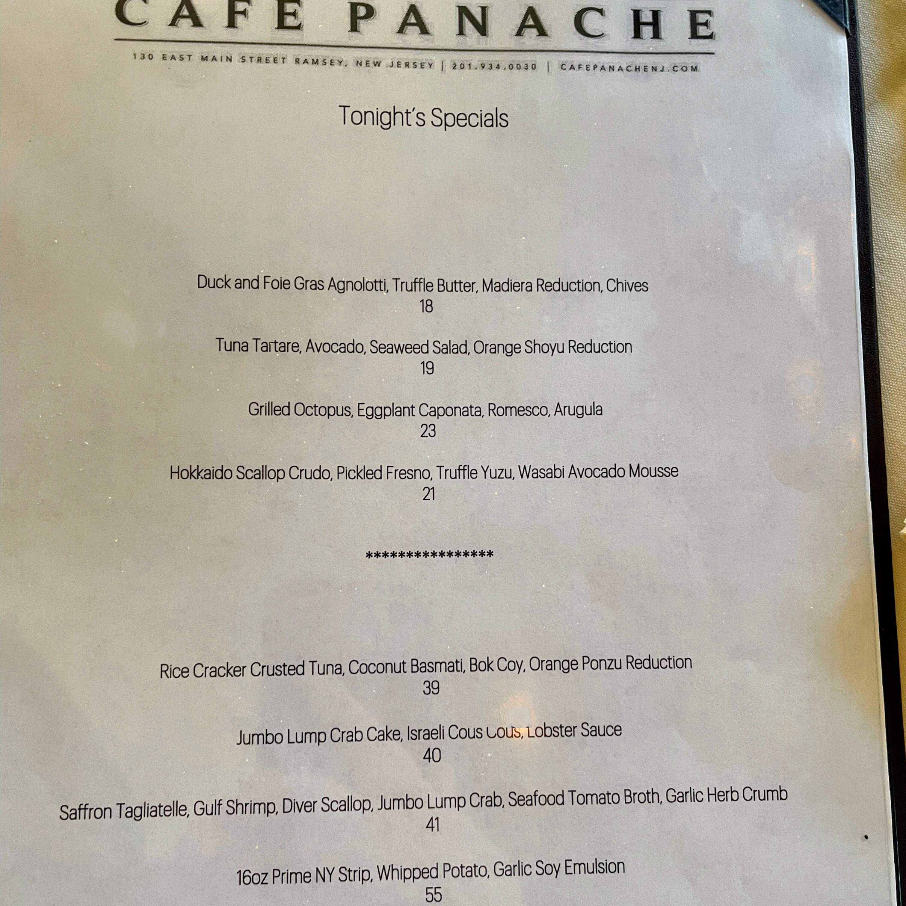 We enjoyed another outstanding dinner at Cafe Panache, in Ramsey, NJ, including Hokkaido scallop crudo; duck and foie gras agnolotti; crispy rice cracker crusted tuna; tuna tartare; halibut. It all went great with an excellent Malbec and red blend.