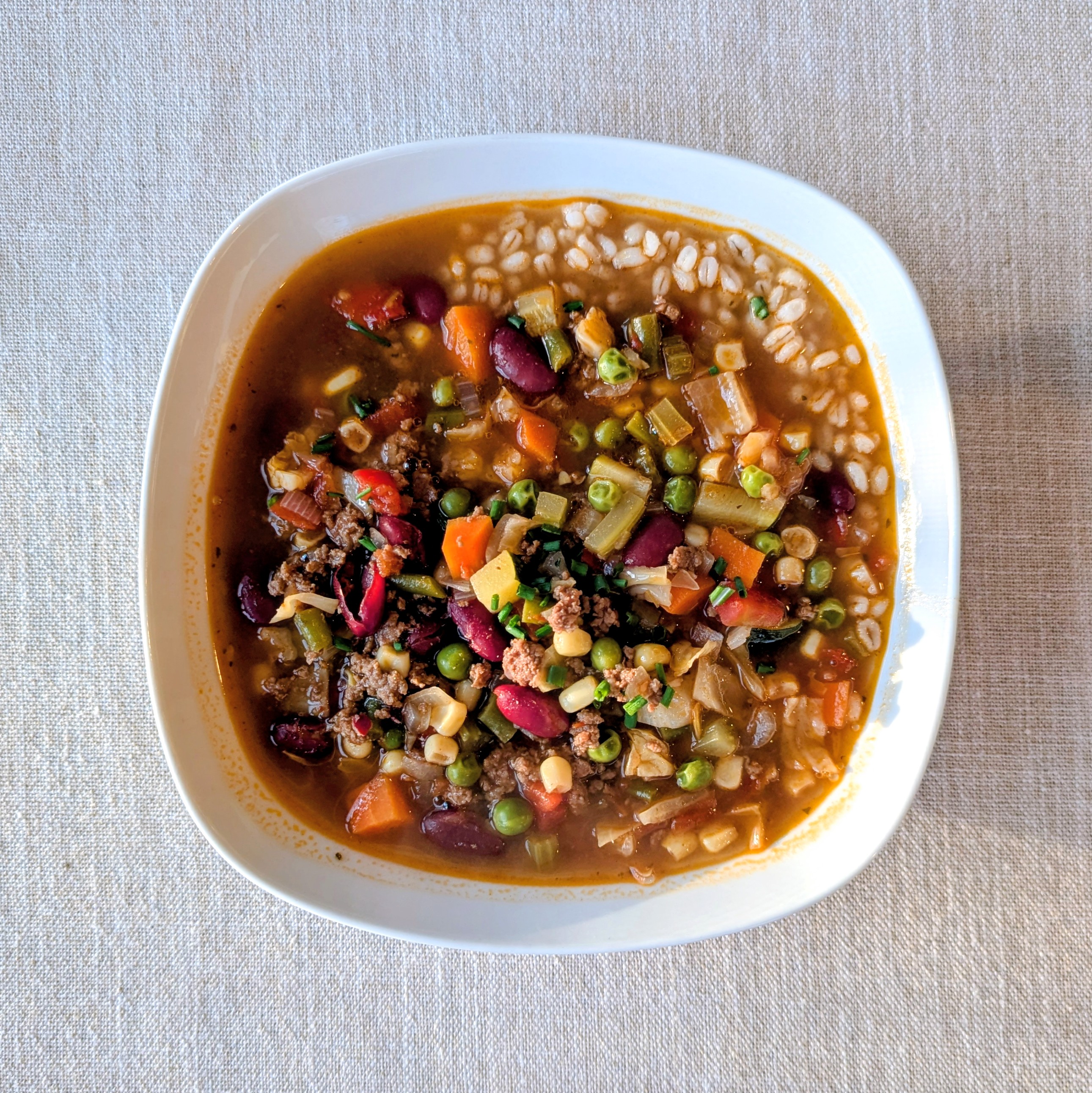 Tonight we made my dad’s beef and barley soup using ground beef, extra veg, and kidney beans, served with sourdough discard focaccia from the freezer. Delish.