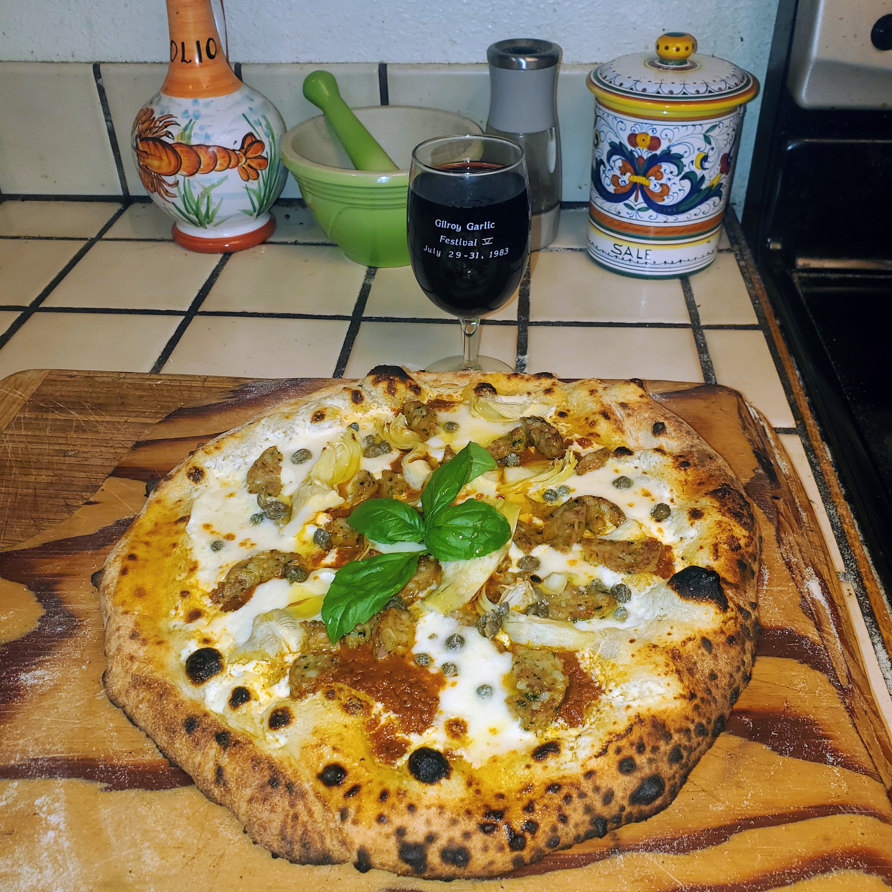 Pizza base Ricotta and grated Parmigiano, with fresh mozzarella, sun dried tomato pesto , artichoke hearts , chicken Boudin sausage, and capers . Cheers.