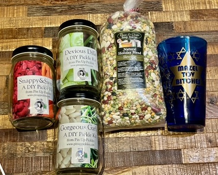 Our friends who just sold their house to live in NYC permanently had a … household dissolution (?) party last night with many friends. There was a raffle where we each drew a couple of numbers to take a few final items off their hands. We both lucked out in our choices in that we got the only food/drink-related items: I got 3 different pickling kits & a huge bag o’ bean soup, plus the hostess specially gifted me a beautiful blue & gold glass that says “Mazel Tov, Bitches.” I feel seen