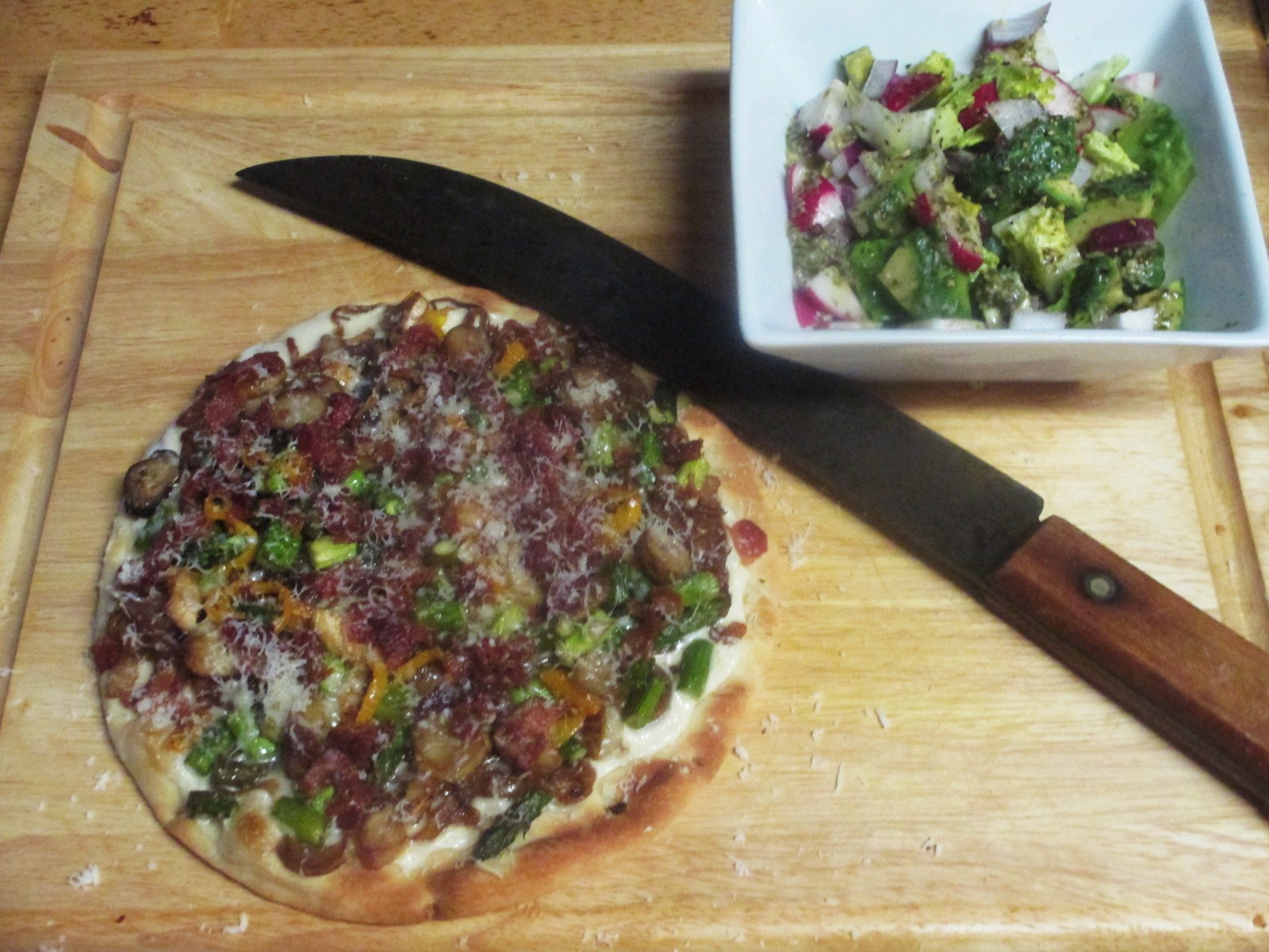 Pizza π. Stonefire crust, alfredo sauce, caramelized onions, asparagus, koms, bacon, rosemary asiago cheese. Little gem, red onion, cucumber, avocado, radish salad, pesto dressing. Everything was delicious, I keep forgetting how much I like that dressing and the π was so good I ate the whole thing.