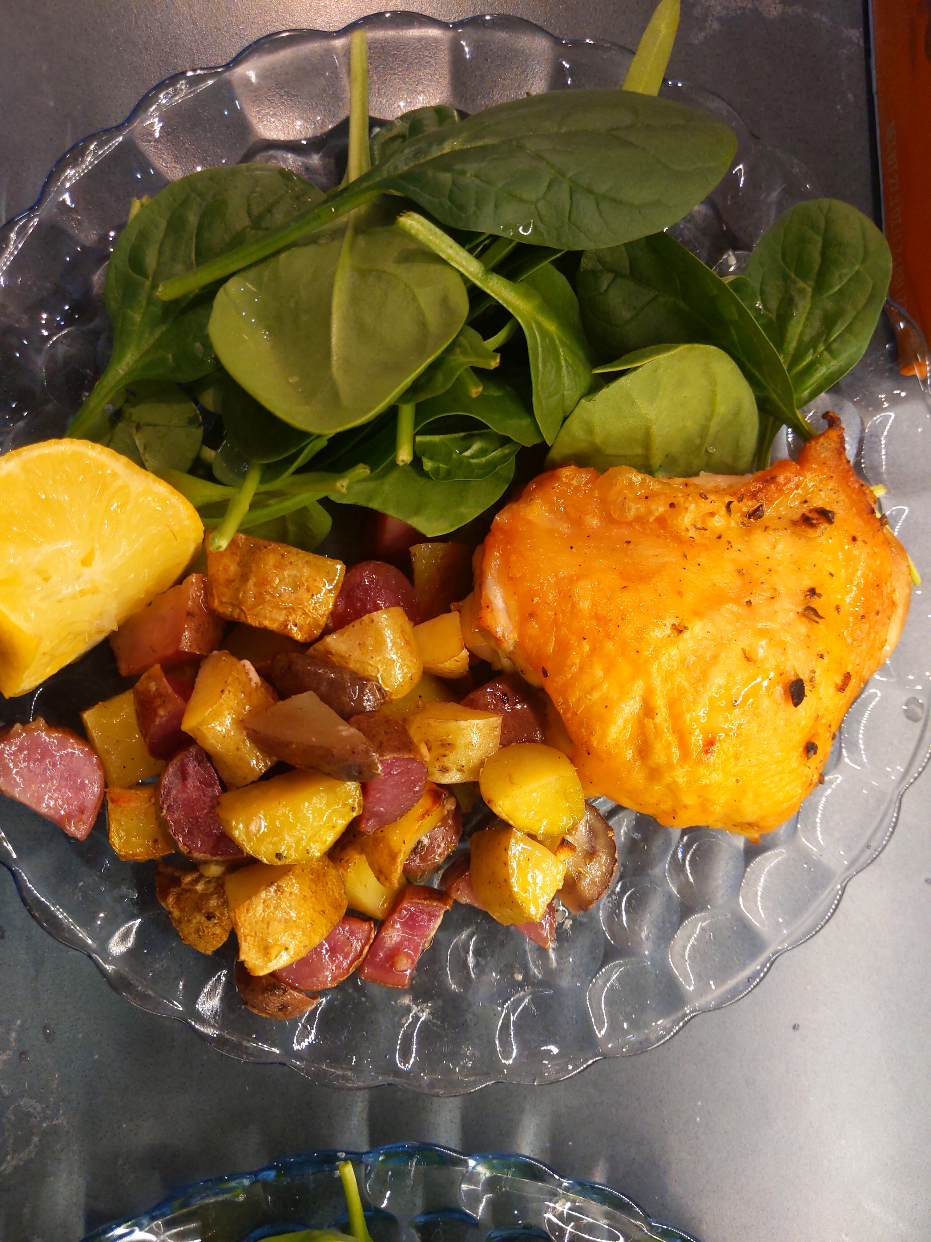 Got back after a weekend away, and was a bit tired so threw together a quick sheetpan meal. Briefly marinated chicken thighs in lemon, olive oil, dried oregano that was gifted to me from Greece and s&p, baked high over some fancy potatoes that were deeply on sale, served with spinach and more lemon for squeezing.