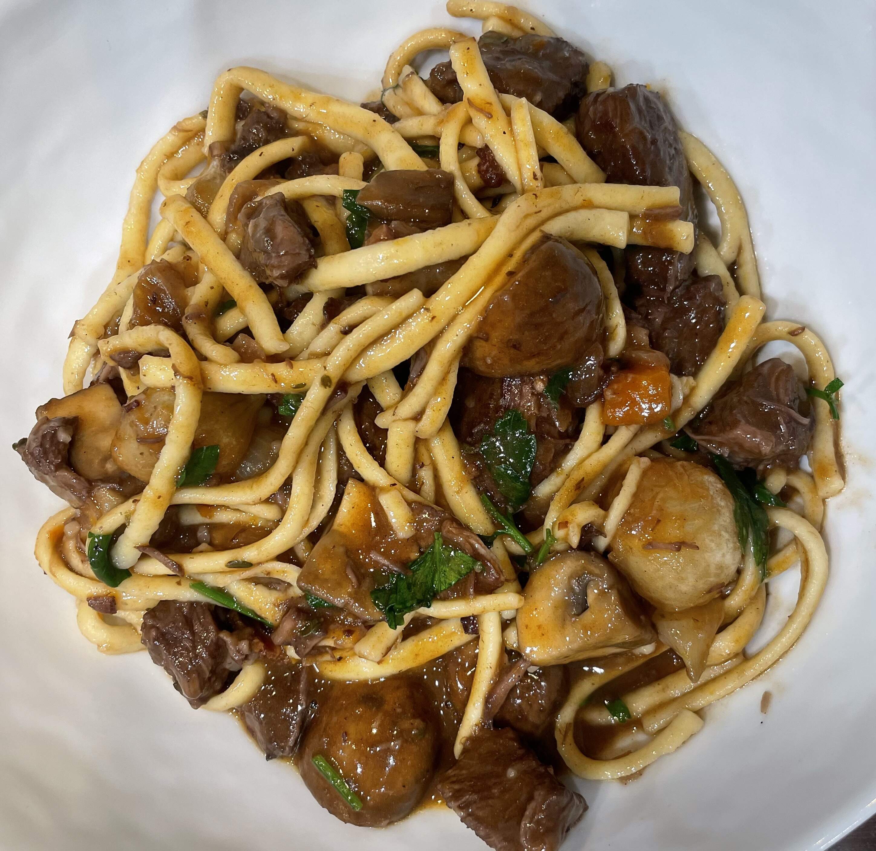 Classic Boeuf Bourguignon from “Dinner in an Instant” by Melissa Clark - cubed beef chuck, bacon, red onion, carrots, garlic, thyme, bay leaves, tomato paste, flour and red wine are cooked in a pressure cooker for 25 minutes with natural release. In parallel, you sauté pearl onions and cremini mushrooms until nicely browned. Mushroom mixture parsley are added to the stew and served with spaetzle