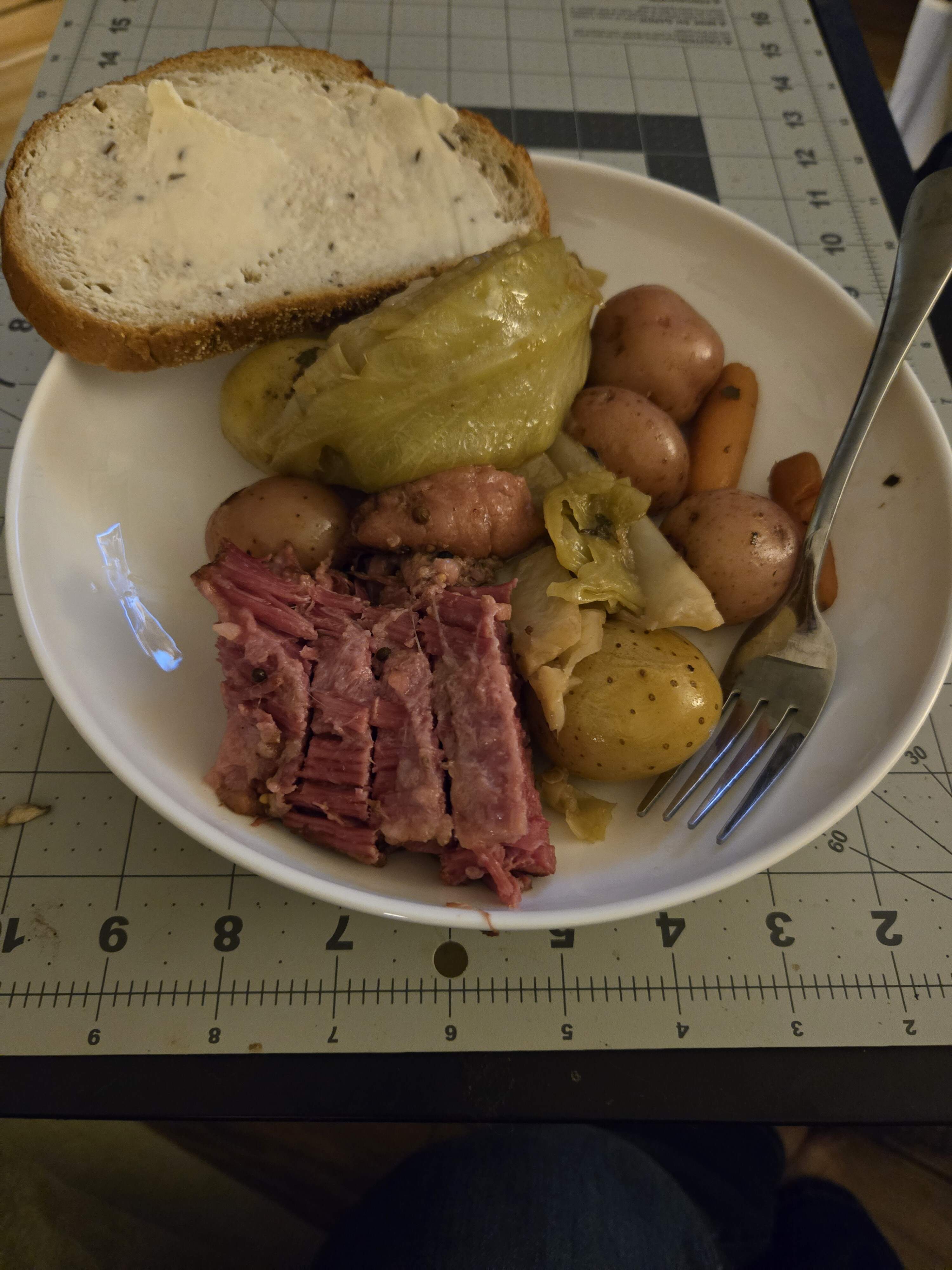 Aldi had a tiny corned beef this weekend so into the baby IP it went. 45 min til tender then another 5 with the cabbage and taters and carrots.