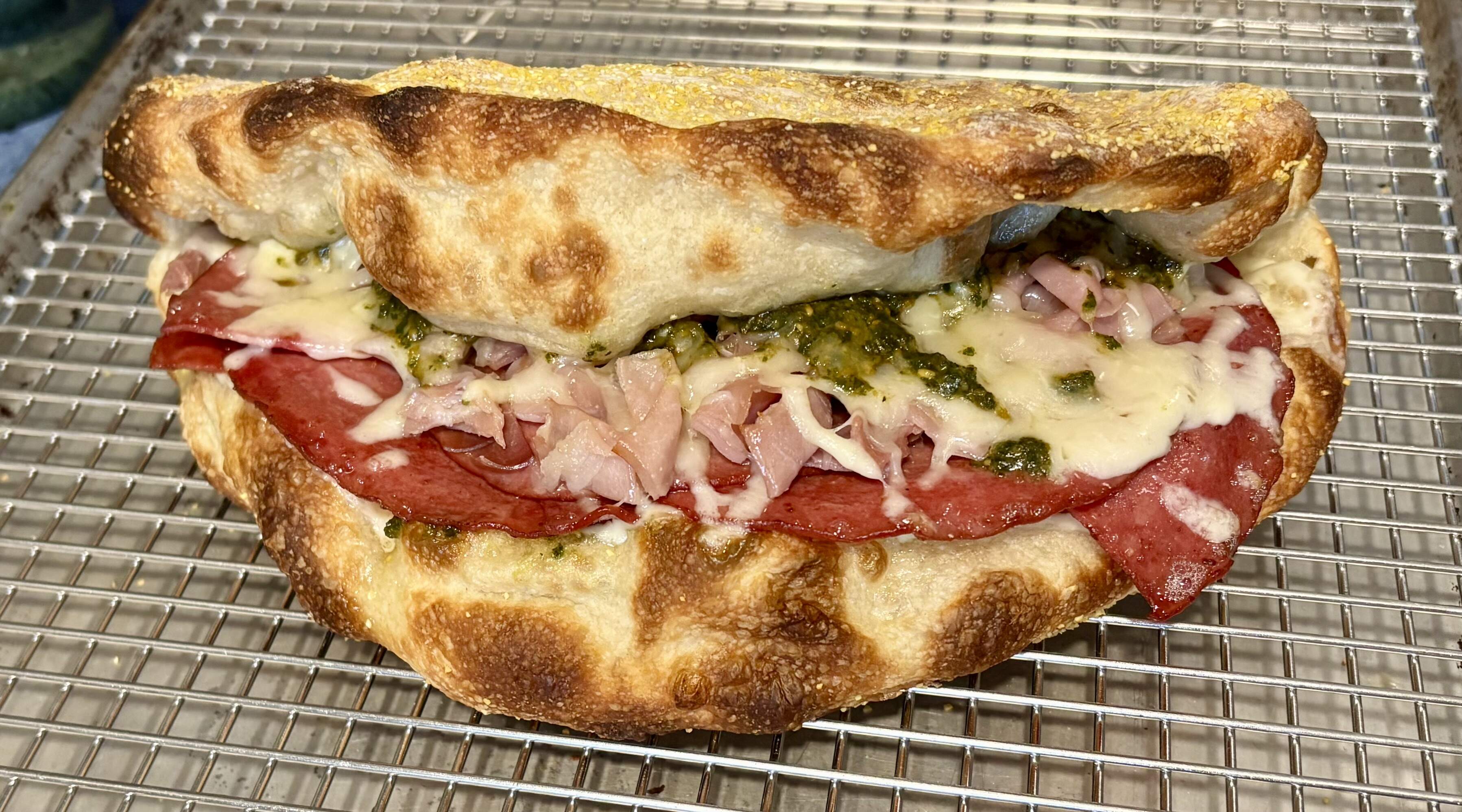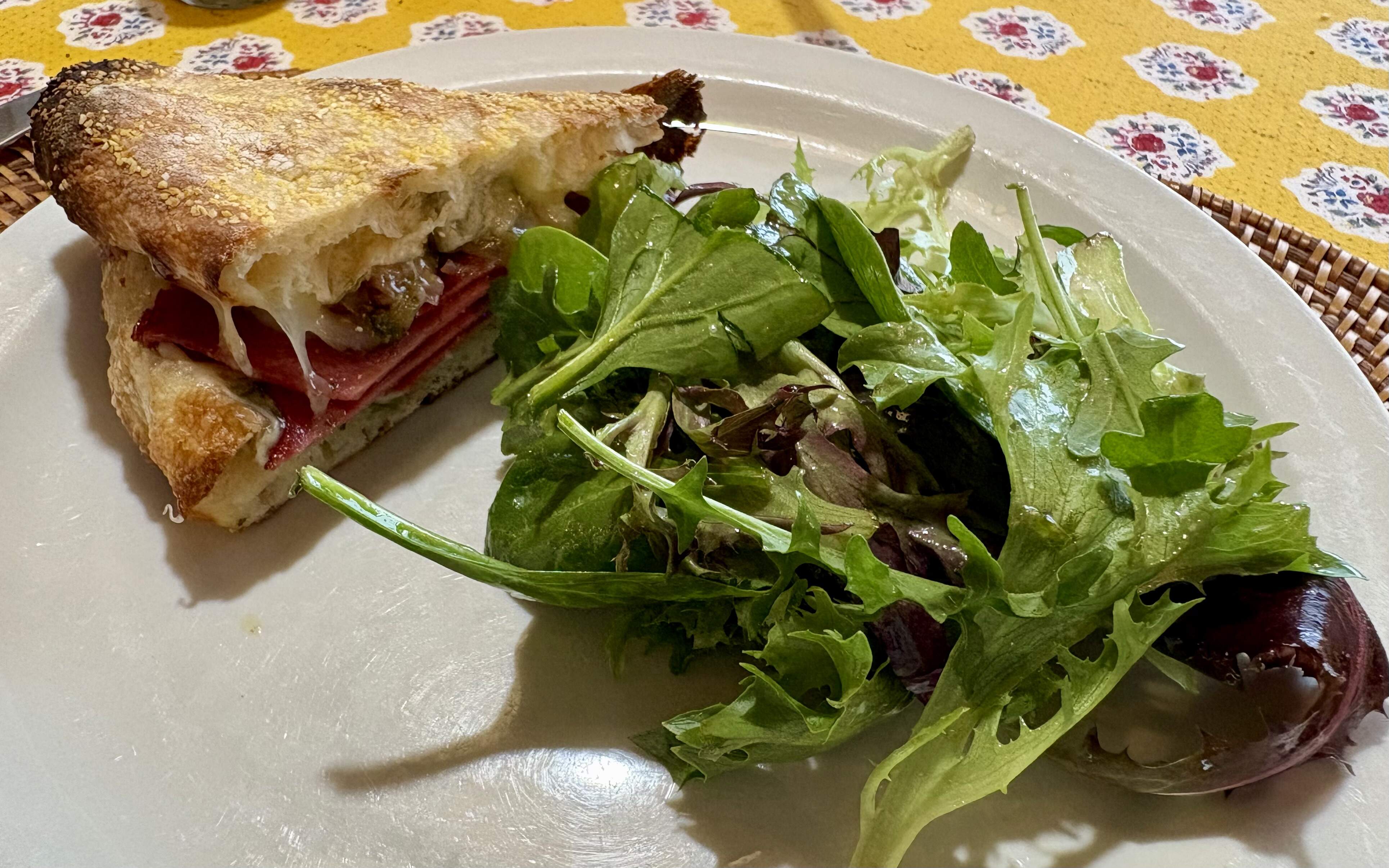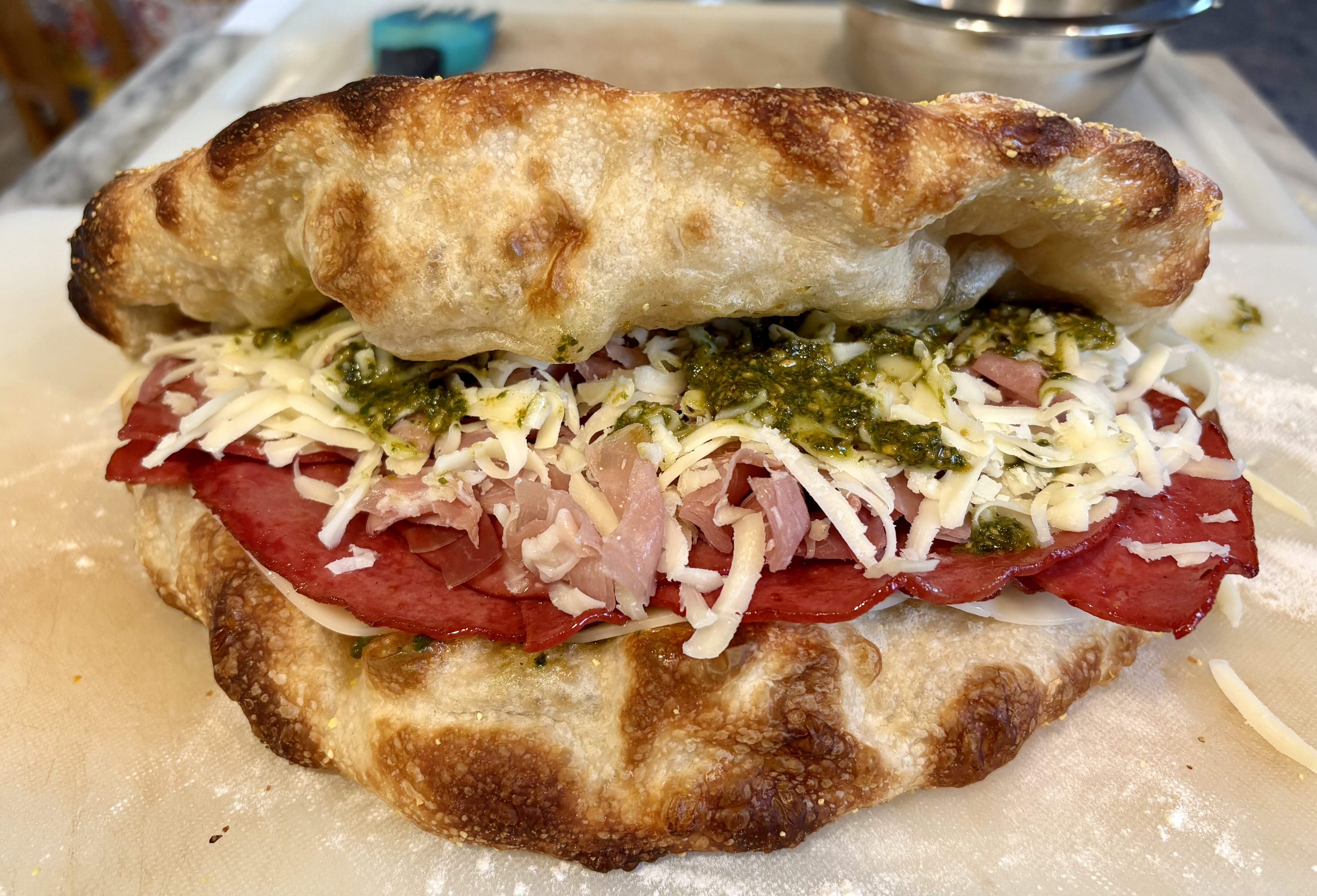 Panuozzo with fried bologna, prosciutto, provalone, mozzarella, and basil pesto. Salad greens in vinaigrette to go with.