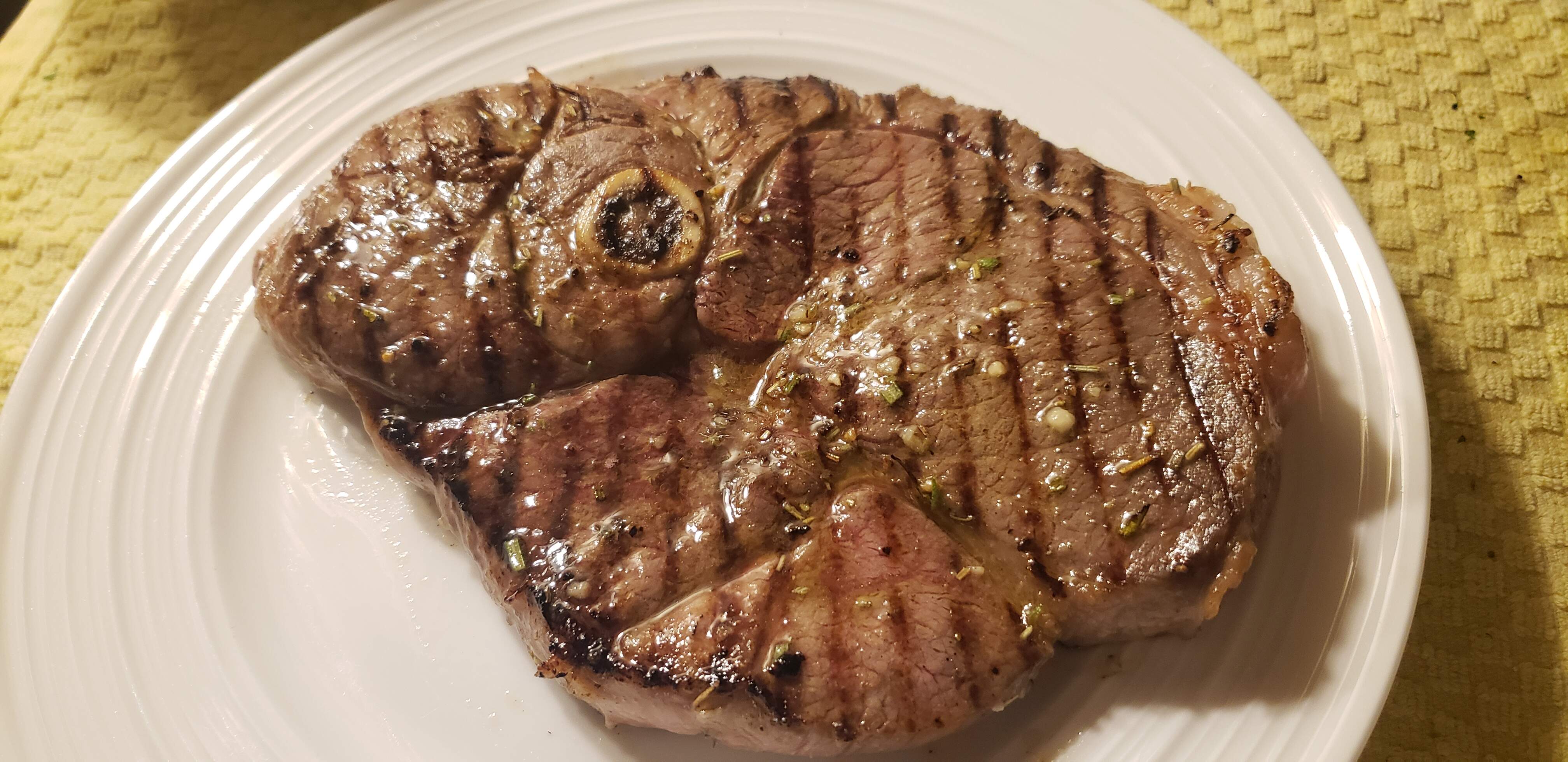 Did an hour long marinade of olive oil, lemon juice, minced garlic, minced rosemary and s/p, and grilled for 3.5 minutes a side on a hot cast iron grill pan. Got it to a very nice medium-rare.