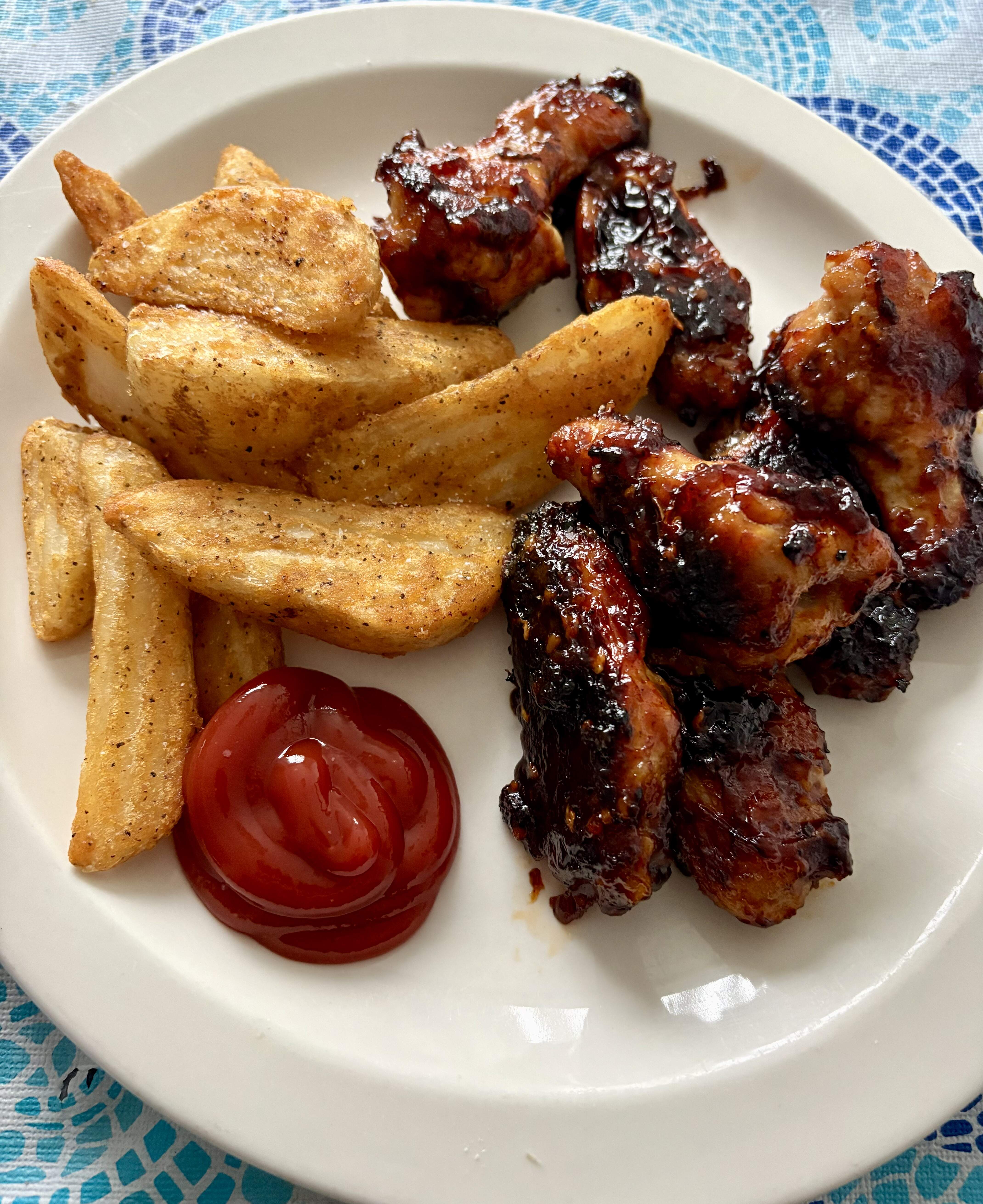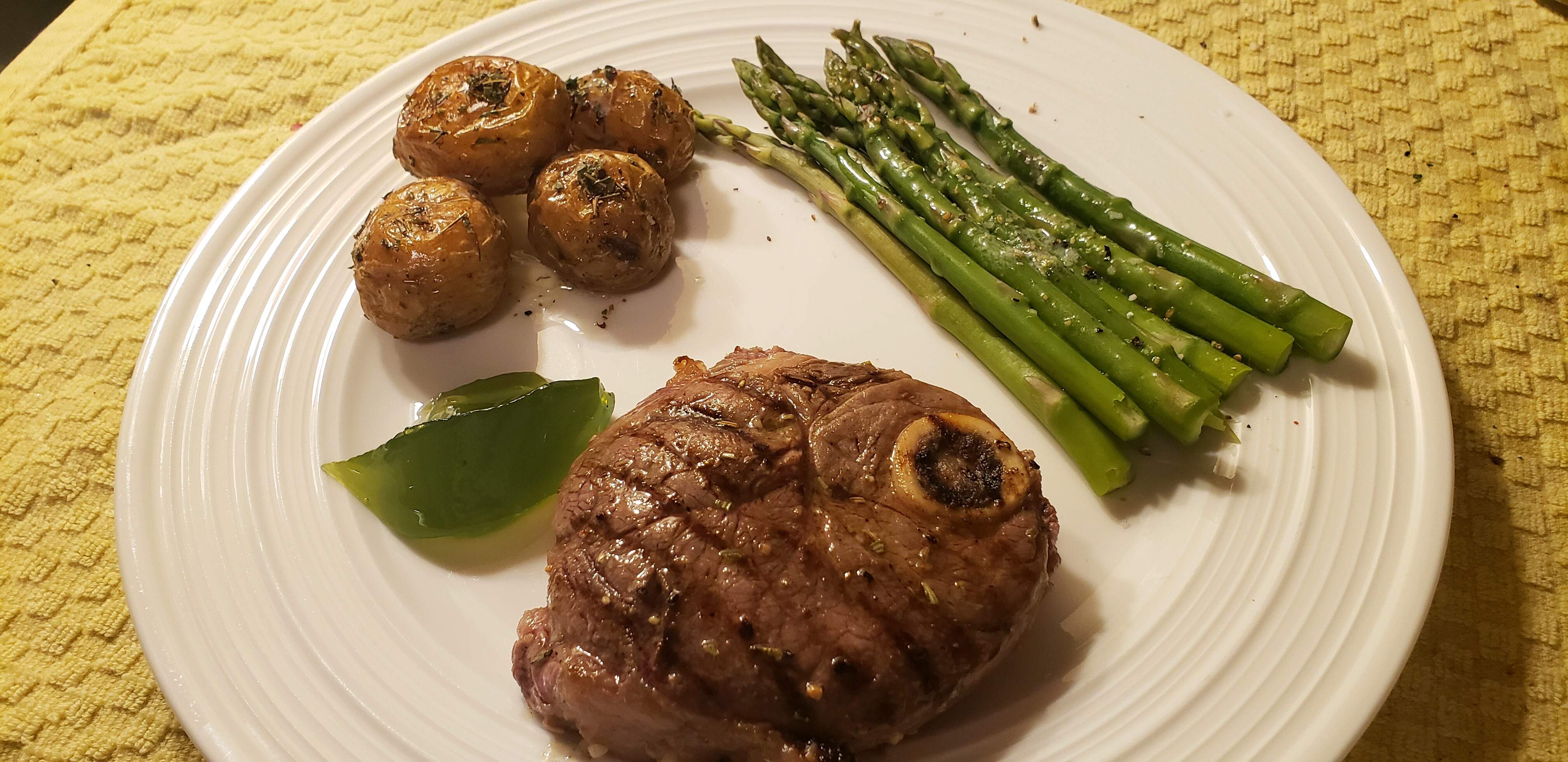 Sides were baby potatoes steamed for 15 minutes, then tossed with olive oil and s/p, and into the convection oven at 375° for 40 minutes, regular heat for half the time, convection heat for the rest of the time, and then tossed with dried marjoram and savory.
