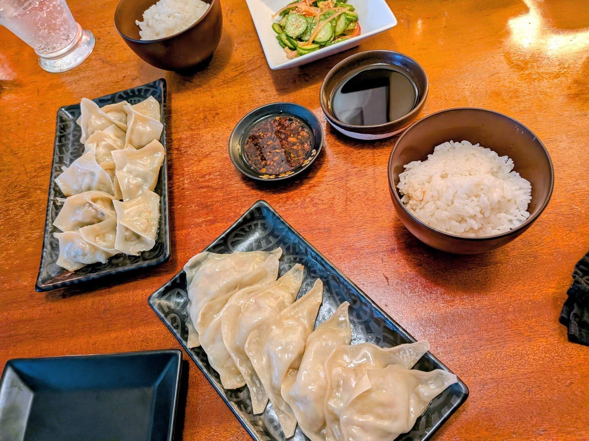 Chinese chicken dumplings. I made the filling - ground chicken, cabbage, Shaoxing wine, white pepper, ginger, garlic, sugar, soy sauce, a little chicken powder, and sesame oil - and filled the wrappers, BF cooked them - half steamed, half pan-fried. Tasty! Cuke salad and steamed rice. Good on a very hot (for San Francisco) day.