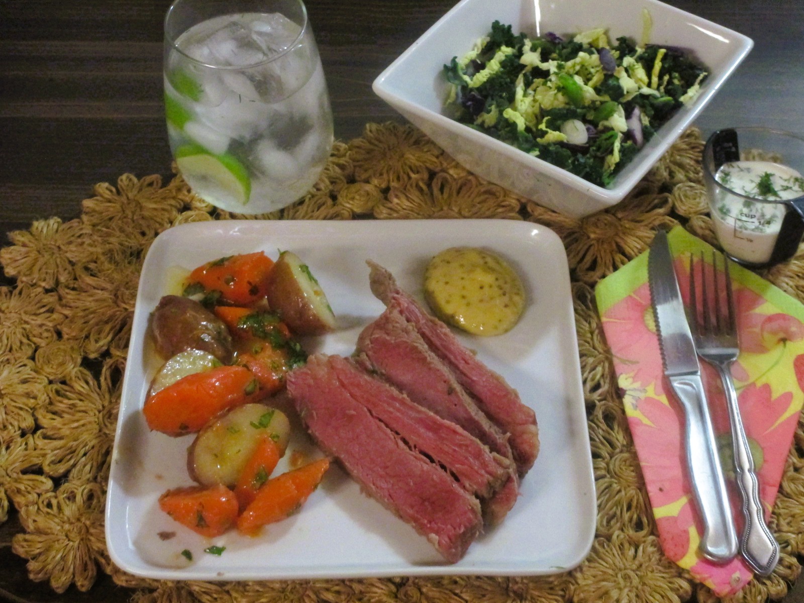 More corned beef, mustards and horseradish sauce; little red potatoes and carrots with parsley butter. Cabbage and the color green was in the slaw. Savoy and red cabbage, kale, snap peas, green onion, creamy dill dressing. Double bg&t with double the limes. Exhausting day, good thing I cooked the corned beef Sunday and had it resting in it’s juice in the fridge.