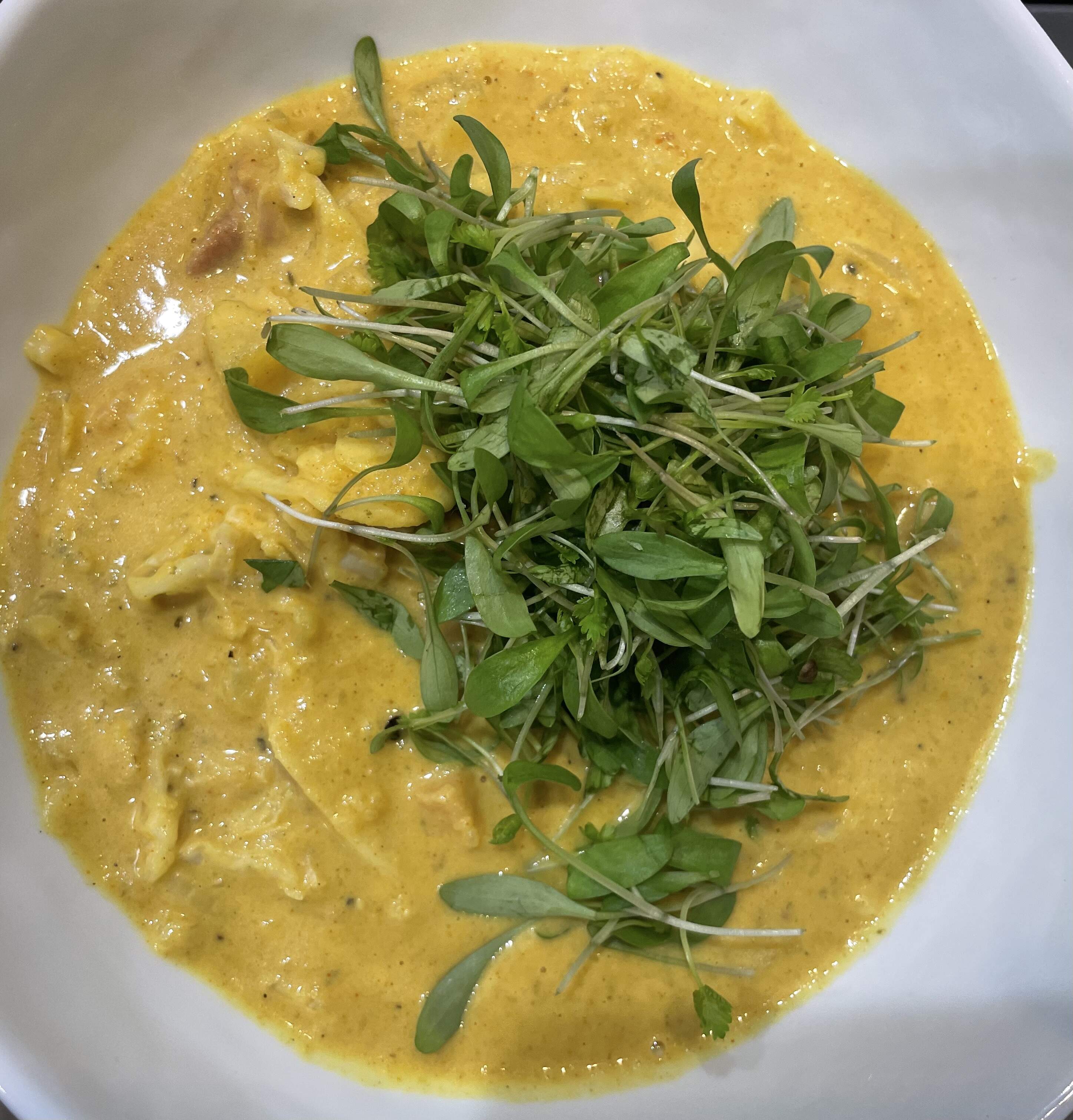 Curry-Sauerkraut Soup with Kassler from an ancient essen & trinken magazine recipe - sauerkraut, shallots, curry mixture (curry powder, cardamom, paprika, cumin, turmeric, cinnamon and fenugreek) and one small diced russet potato are sautéed and cooked in a mix of vegetable broth, milk and heavy cream. After pureeing, diced, blanched kassler und more sauerkraut are added and topped with micro-cilantro