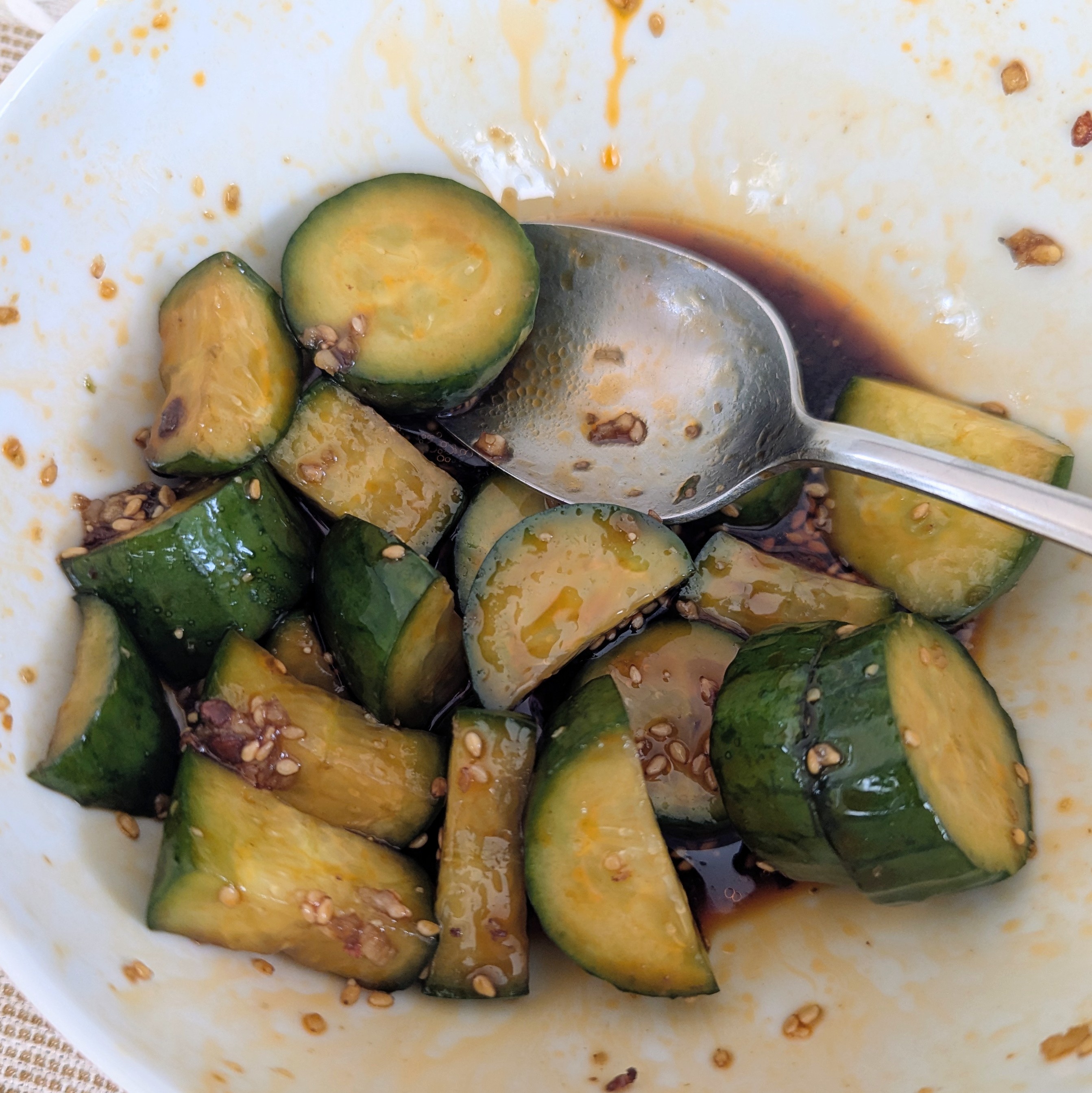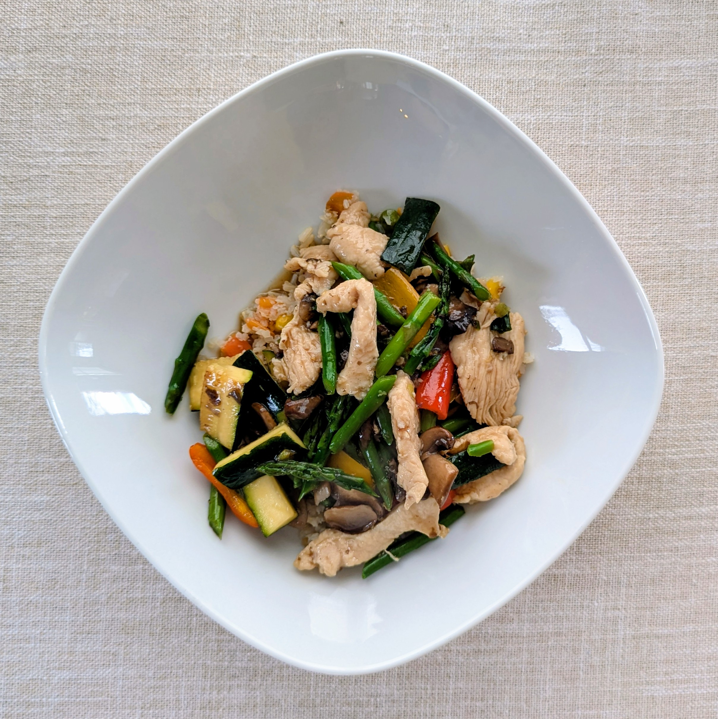 Tonight I made Chinese(-American) chicken and asparagus based on these two recipes. I added a full box of criminis, some mini sweet peppers, and a stub of zucchini. It turned out well but I didn’t like the cauliflower fried rice I mixed into some brown rice for the base. A bit clashy with the main. Side of spicy cucumber salad with black vinegar dressing.